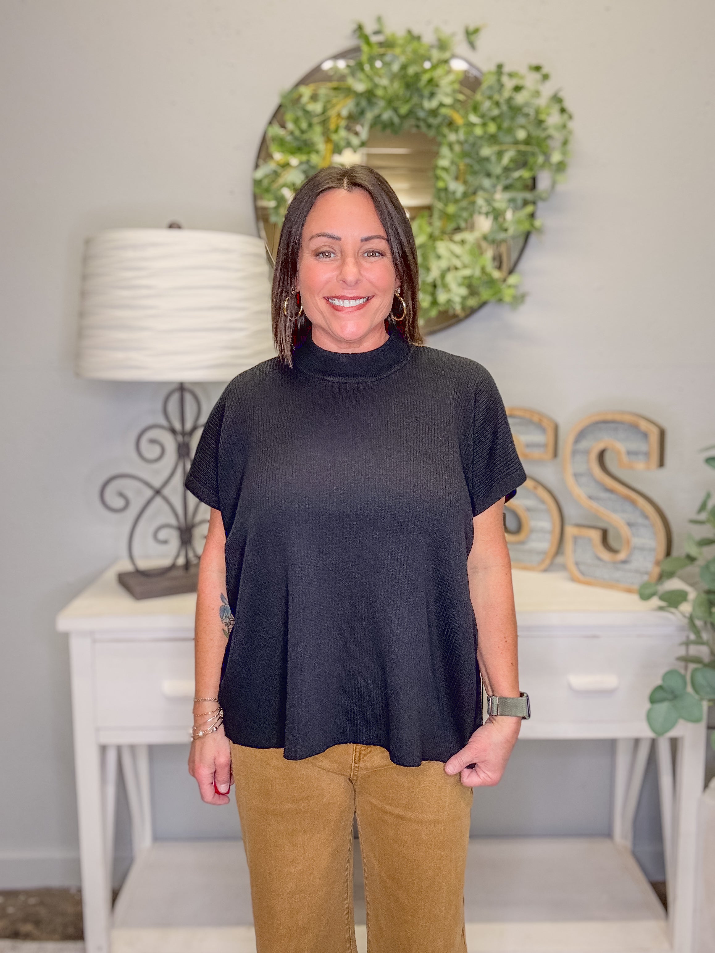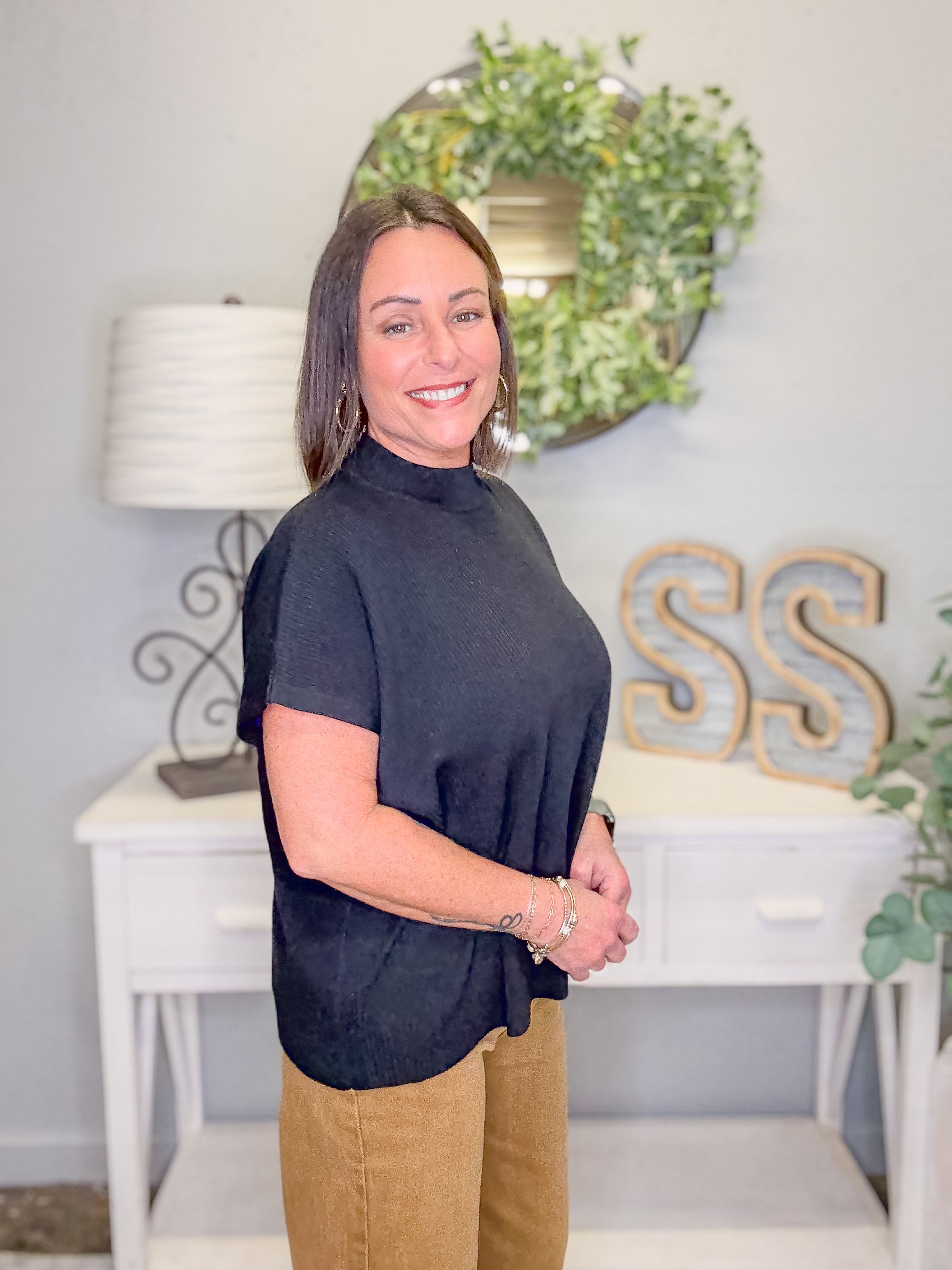 Viscose Mock Neck Short Sleeve Boxy Sweater – Black
