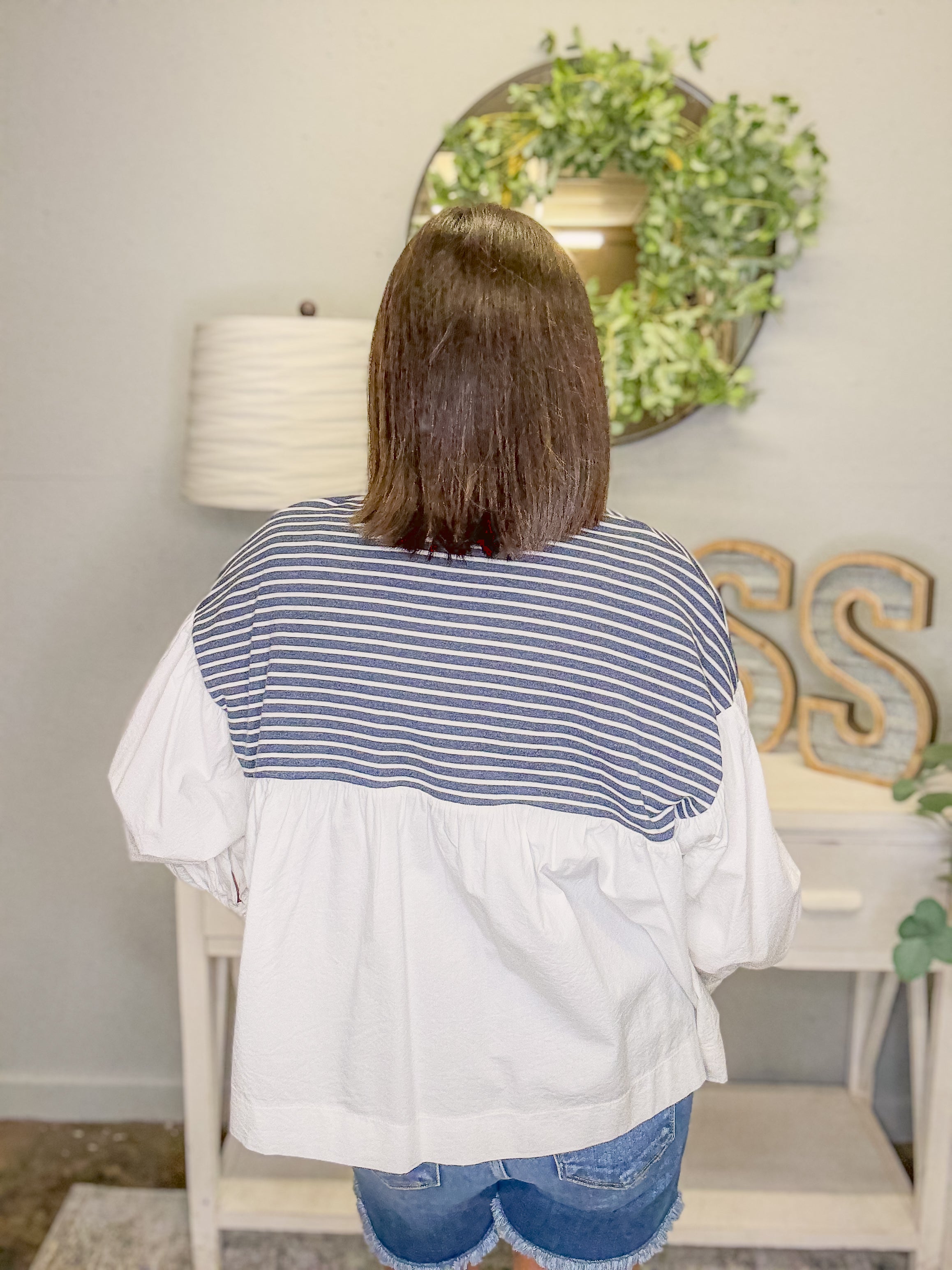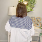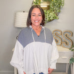Calling all Auburn fans — the War Eagle Game Day Top is made for your Saturdays on the Plains! This top blends comfort and charm with a front-tie neckline, soft navy and white stripe detail, and billowy long sleeves. Easy to dress up or down, it's the perfect piece for tailgates, campus strolls, or watching the game at your favorite spot.