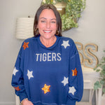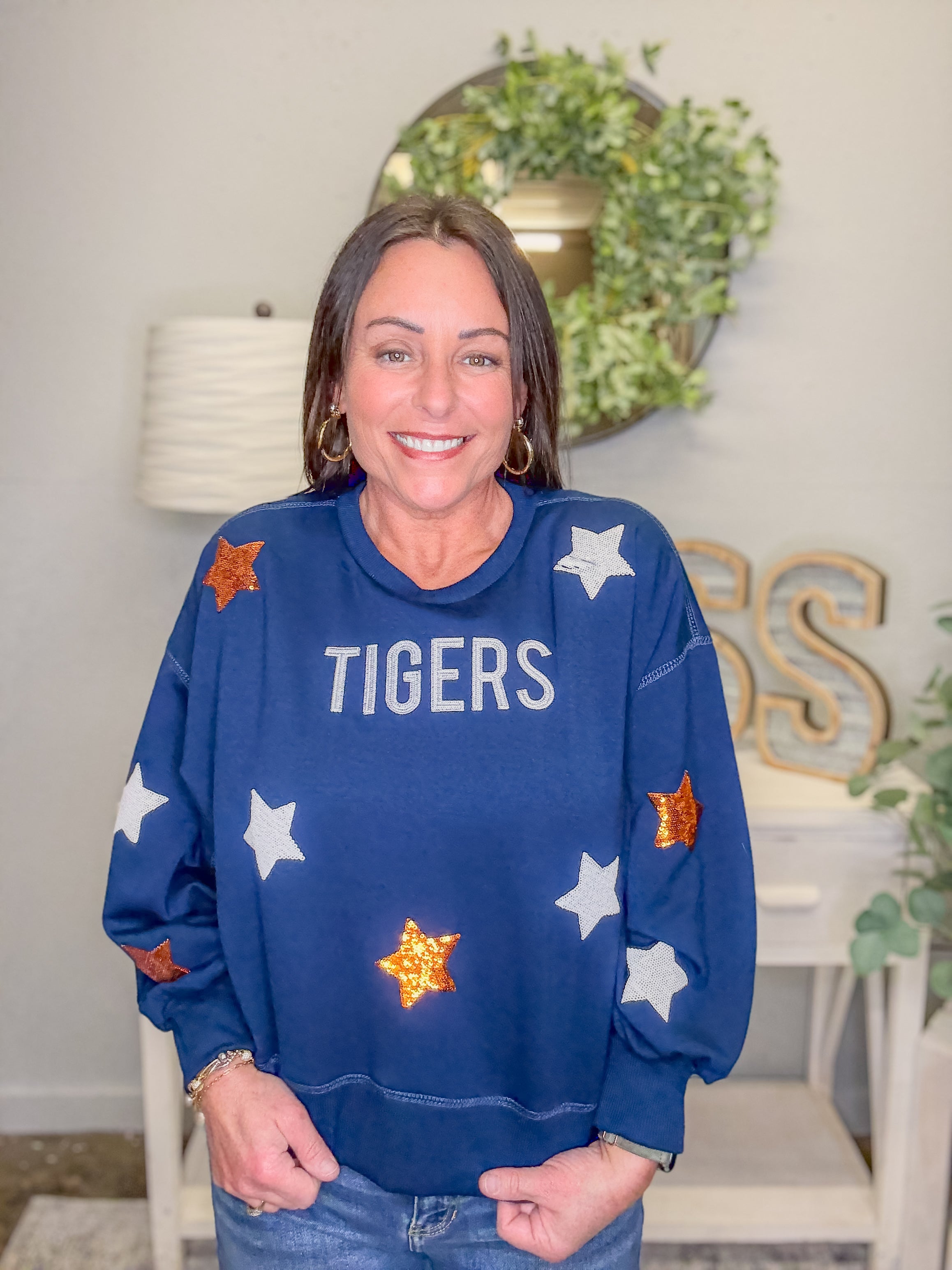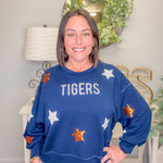War Eagle, y’all! The best-selling Millie Sweatshirt is back, and this time it's decked out in navy with orange and white sequin stars that scream Auburn spirit! This comfy, oversized sweatshirt is the perfect way to stay cute and cozy for game day tailgates or chilly fall weekends. The white “TIGERS” script on the chest adds the perfect classic touch, while the playful stars bring all the sparkle!