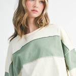 She’s got that effortless, throw-on-and-go energy you love. This sage and cream colorblock top features bold paneling, soft exposed seams, and a loose, boxy fit that feels relaxed without looking sloppy. Designed for comfort with a touch of style, it’s perfect for breezy days, casual outings, and cozy nights in.