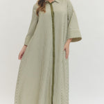 Effortless, timeless, and perfect for everyday wear — this striped midi dress features a classic shirt-collar silhouette with subtle details that make it both polished and comfortable. The hidden button–front closure adds a clean, minimal look, while the 3/4 sleeves and lightweight woven fabric keep it easy and breathable. Side pockets complete the look for functional charm.