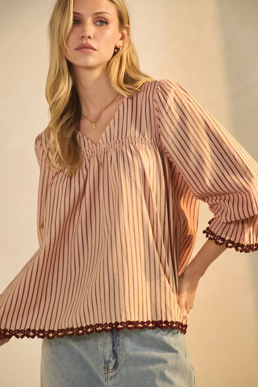 Effortlessly chic, this striped blouse is perfect for both workdays and weekends. Featuring a relaxed silhouette with delicate bow lace trim along the hem and cuffs, it pairs feminine details with a timeless stripe print. The elastic ruffle cuffs add a touch of softness while keeping the fit comfortable.