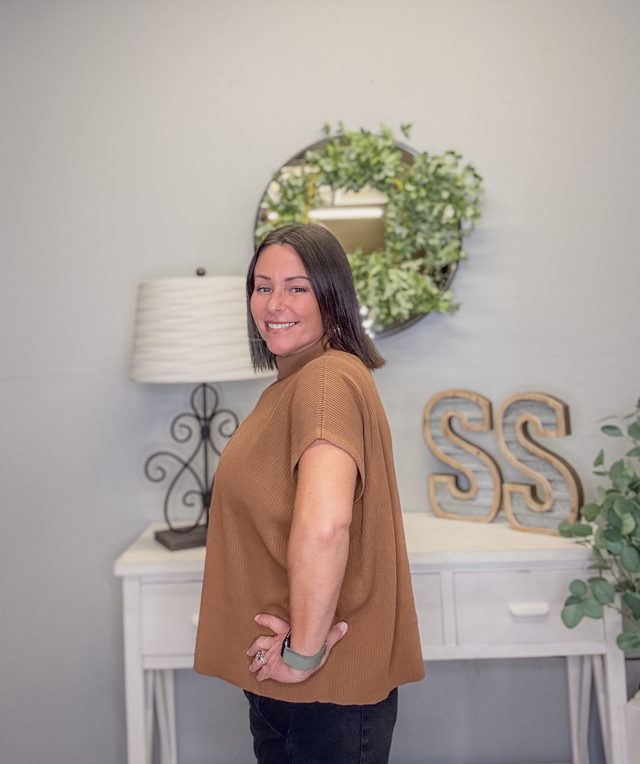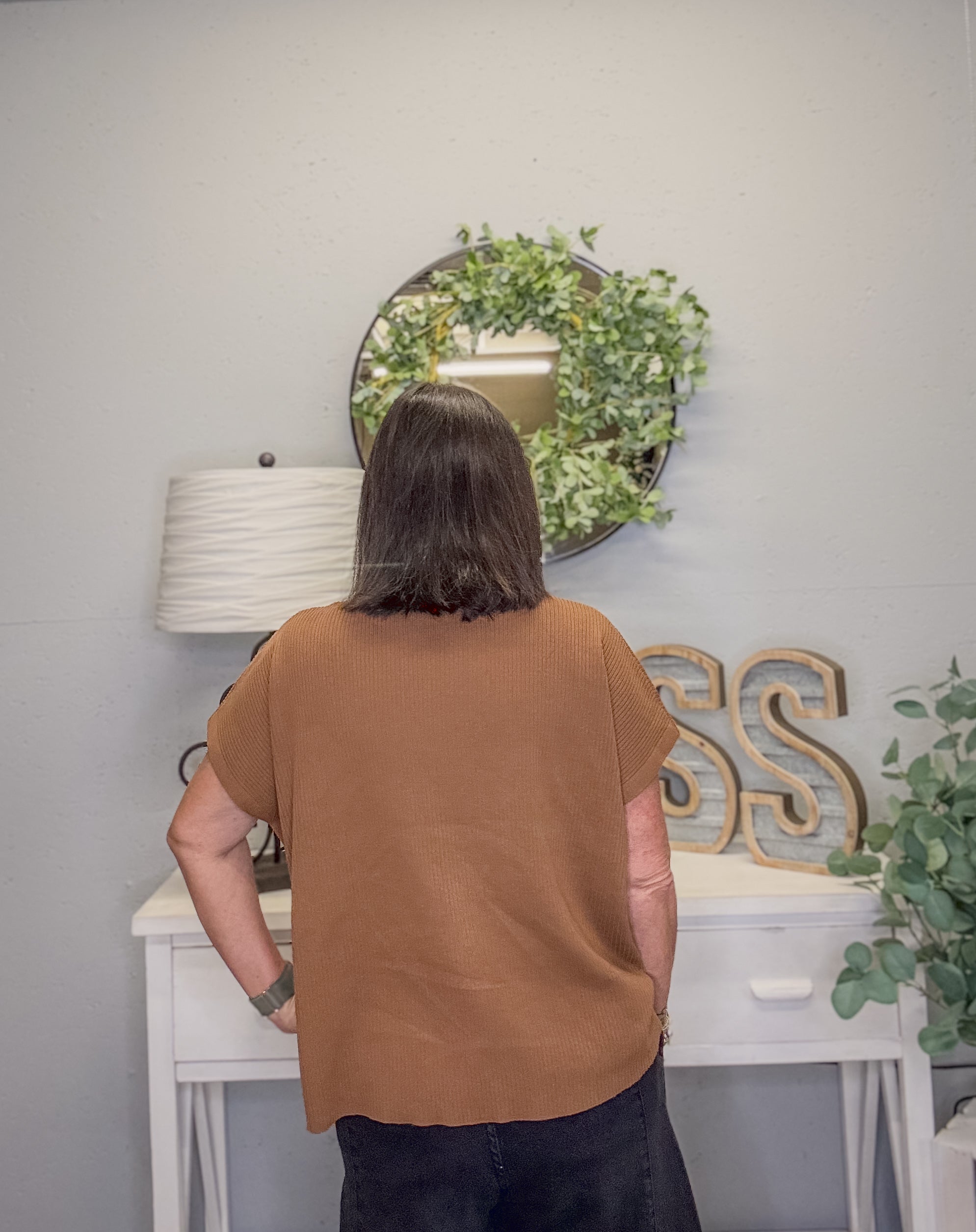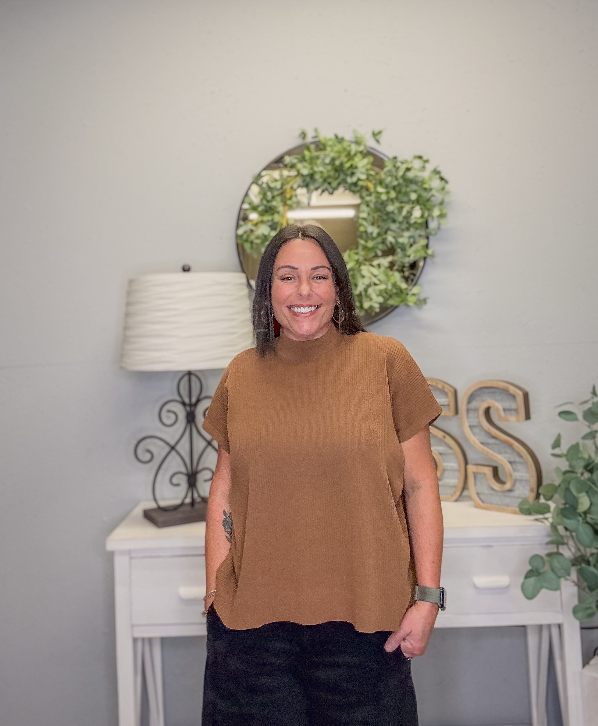 Effortless and chic, this Viscose Mock Neck Boxy Sweater is the perfect piece to elevate your everyday wardrobe. Designed in a warm deep camel hue, it features a relaxed boxy fit, short sleeves, and a classic mock neckline. Soft and lightweight, this sweater drapes beautifully and pairs easily with denim, trousers, or skirts for a versatile look.
