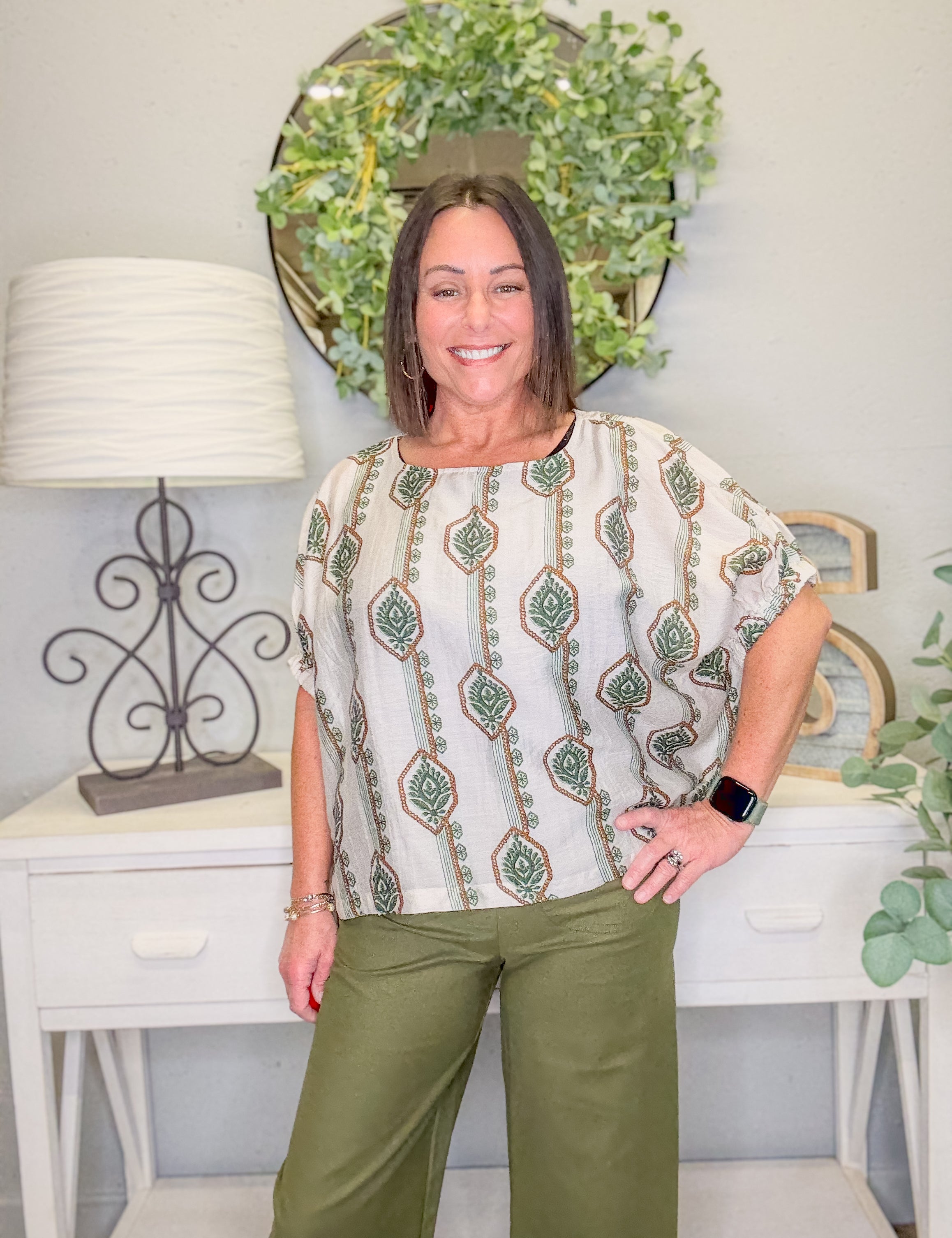 Geometric Floral Printed Elastic Cuff Blouse