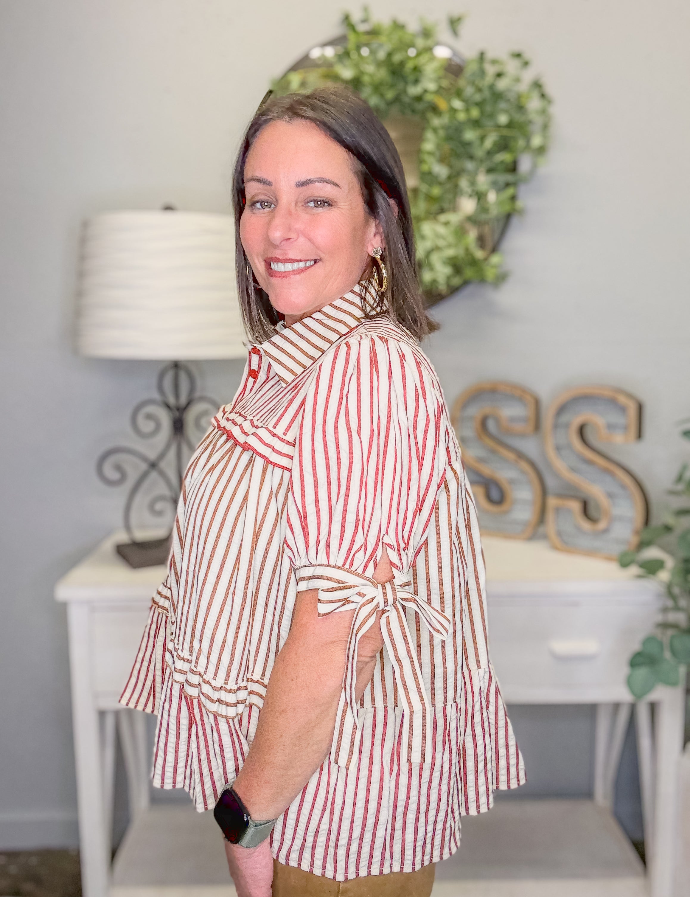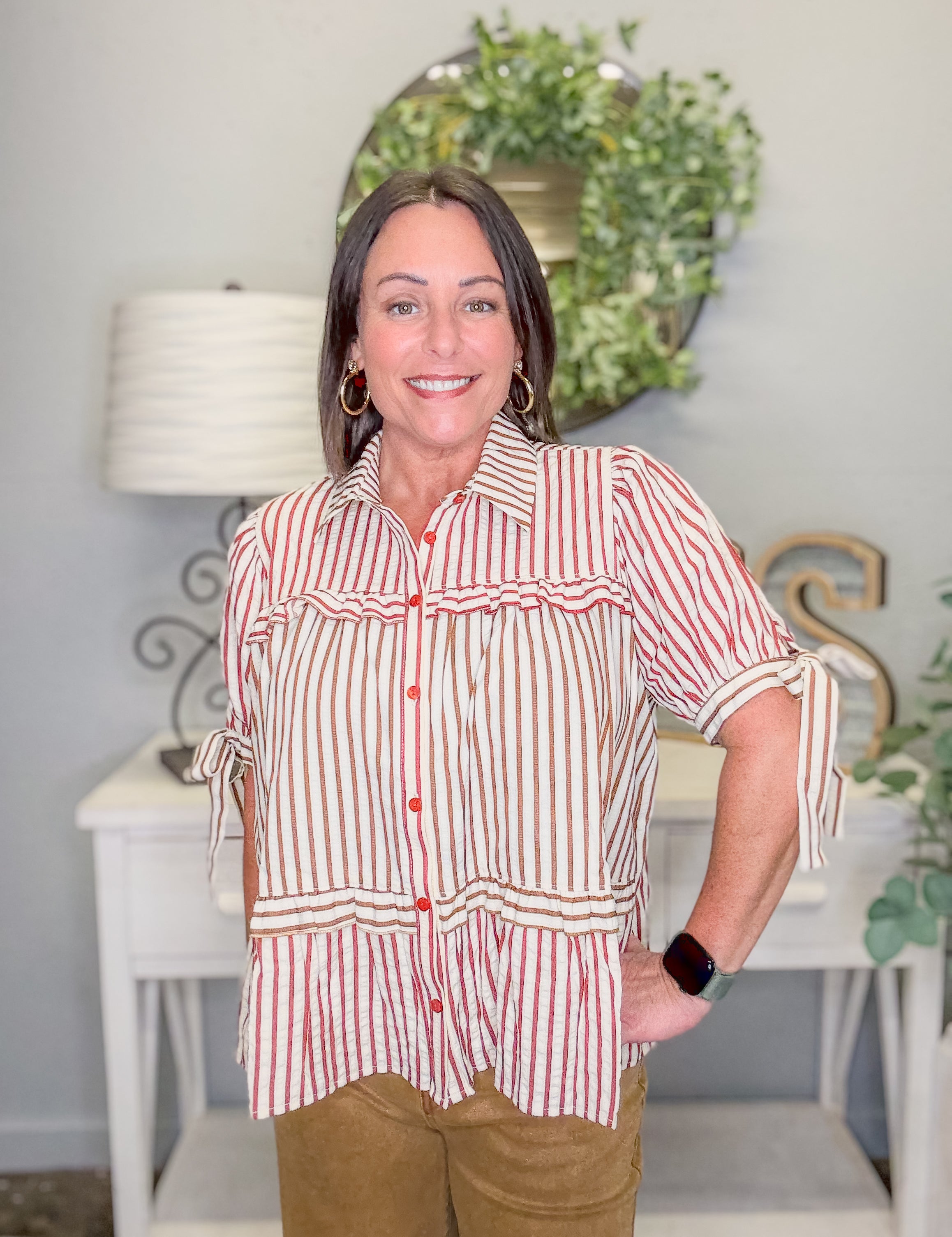 Stripe Tiered Button-Up Blouse – Mocha Burgundy Cream