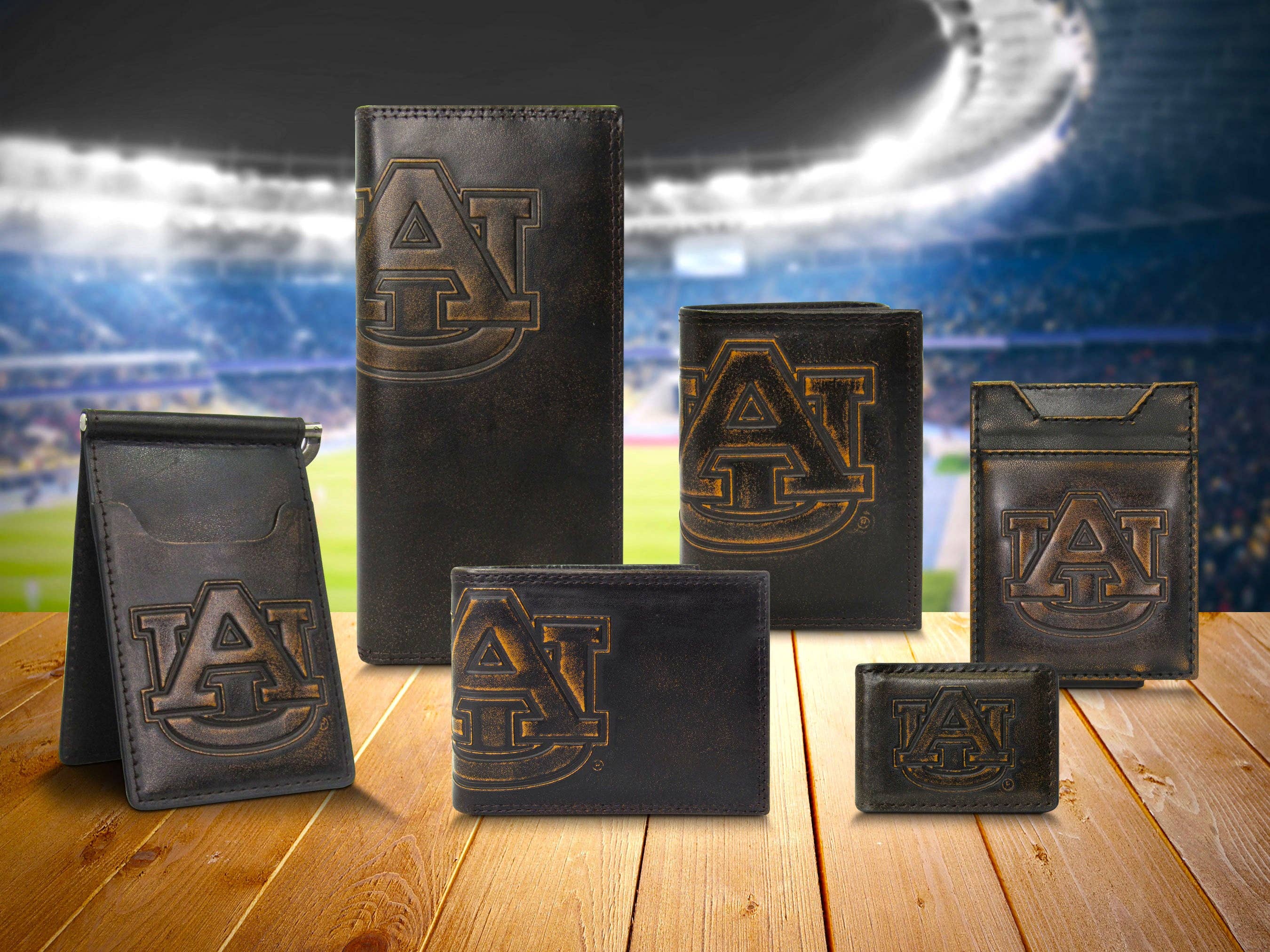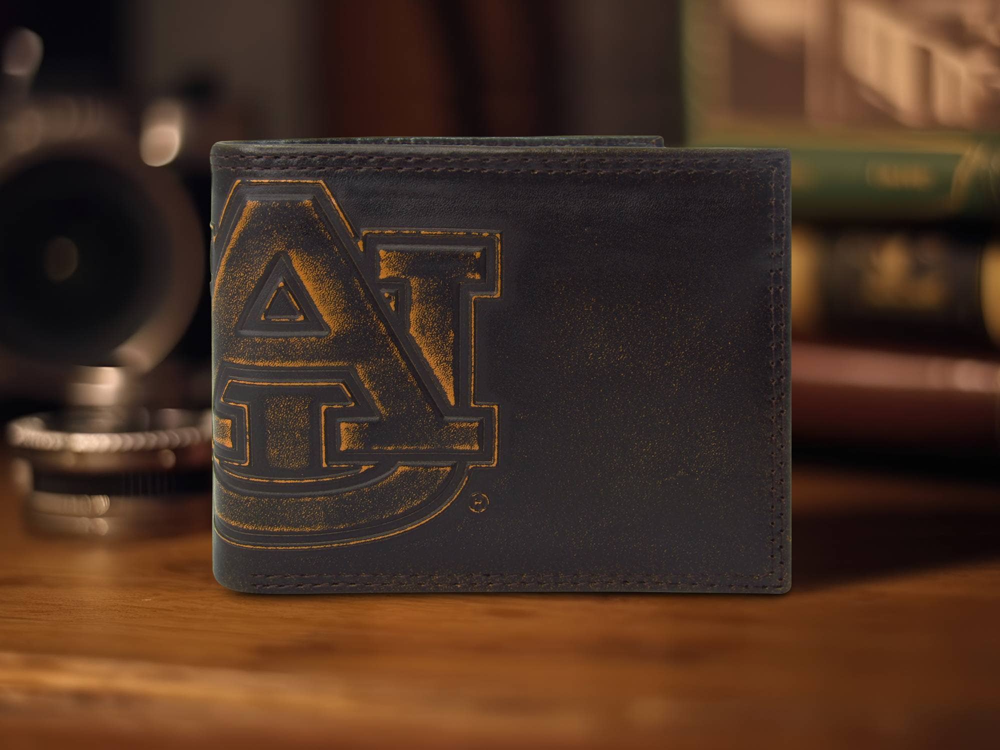 Show your Auburn Tigers pride with an original Zep-Pro collegiate burnished leather bifold wallet. This accessory is popular among college students and alumni. It is a stylish and unique way to show enthusiasm while keeping important cards and cash organized. This Zep-Pro wallet is constructed of full grain leather with a hand burnished finish and features the school’s official logo, proudly displayed on the overlapping sides. The design and placement of the large logo is intended to appear partially on the front and back.