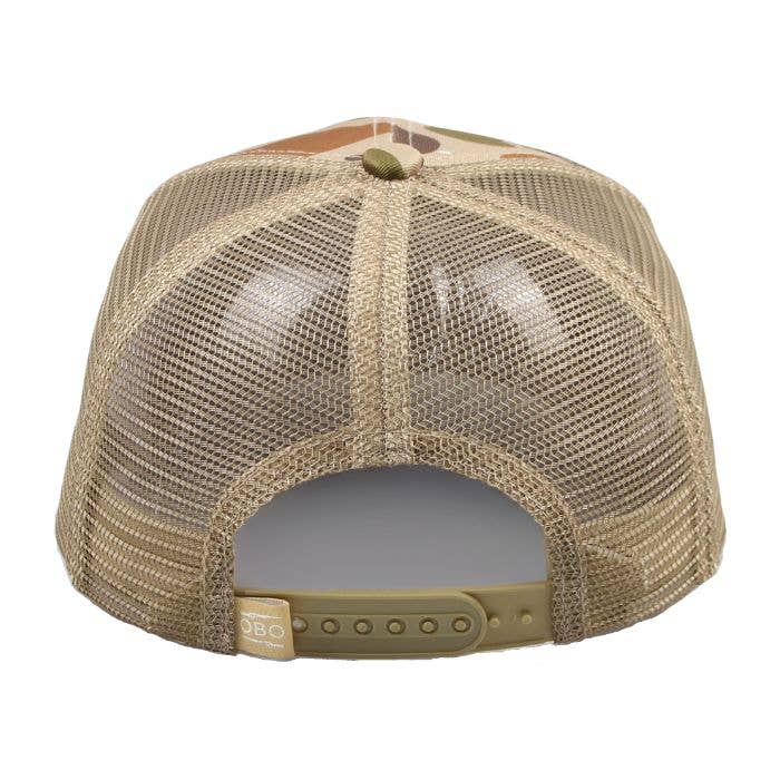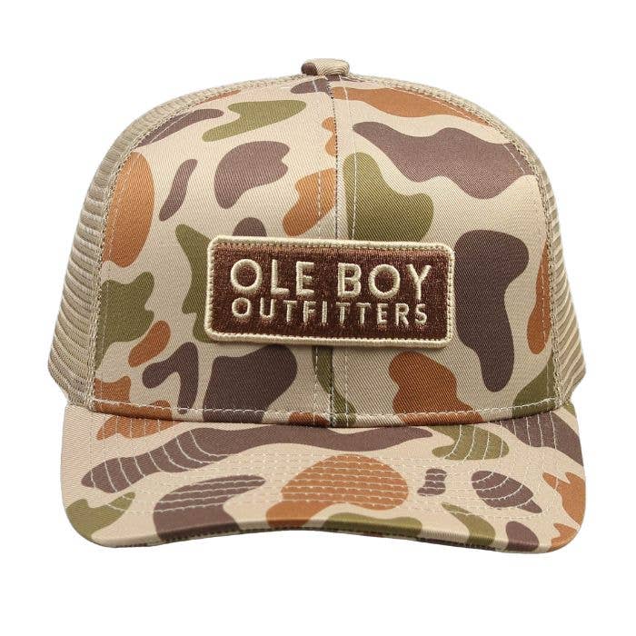 Unleash your inner outdoorsman with the OLE BOY Camo Trucker Hat. Made by Ole Boy Outfitters, this 6 panel trucker hat is perfect for any adventure plus each camo pattern is unique to each hat, making yours a one of a kind. * 6 Panel Snapback * Structured Front * Slightly Curved Brim * Cotton/Polyester Blend * Ole Boy Outfitters Embroidered Patch * 100% polyester mesh back for breathability * Snapback Enclosure * Unique camo print on each hat * Adult Size