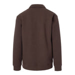 Soft-shell interlock material.  Lower zipped pockets,  deep quarter-zip neck, Fleece-lined hood with drawstring and elastic waist hem.