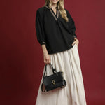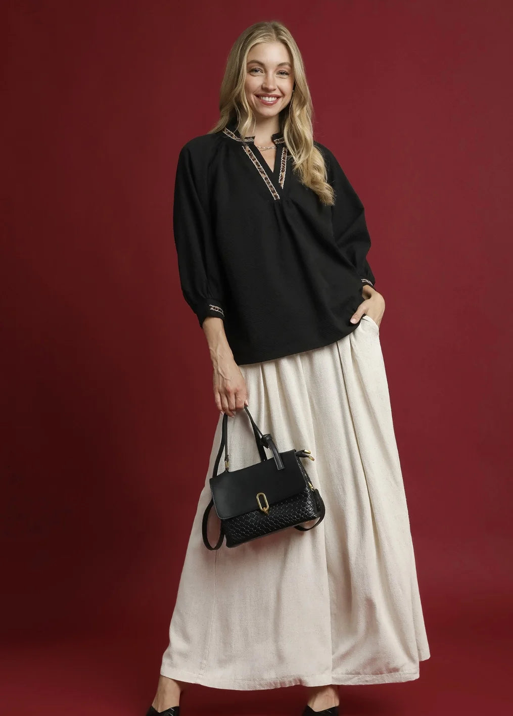 Bring effortless sophistication to your everyday wardrobe with this beautifully detailed top. Featuring a flattering V-neckline with embroidered trim and soft puff sleeves, this piece blends comfort and charm perfectly. The front portion is lightly lined for coverage, making it perfect for work or weekend wear.