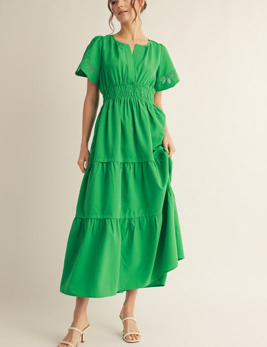 Kelly Green Embroidered Puff Sleeve Maxi Dress