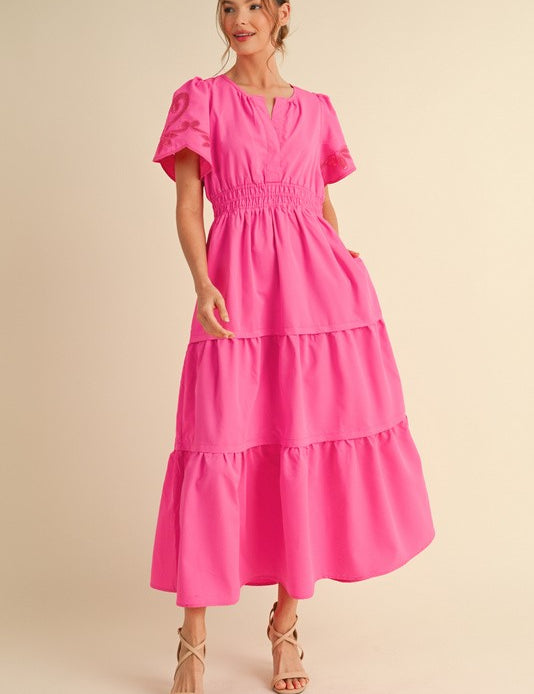 Hot Pink Embroidered Puff Sleeve Maxi Dress