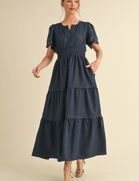 Navy Blue Embroidered Puff Sleeve Maxi Dress