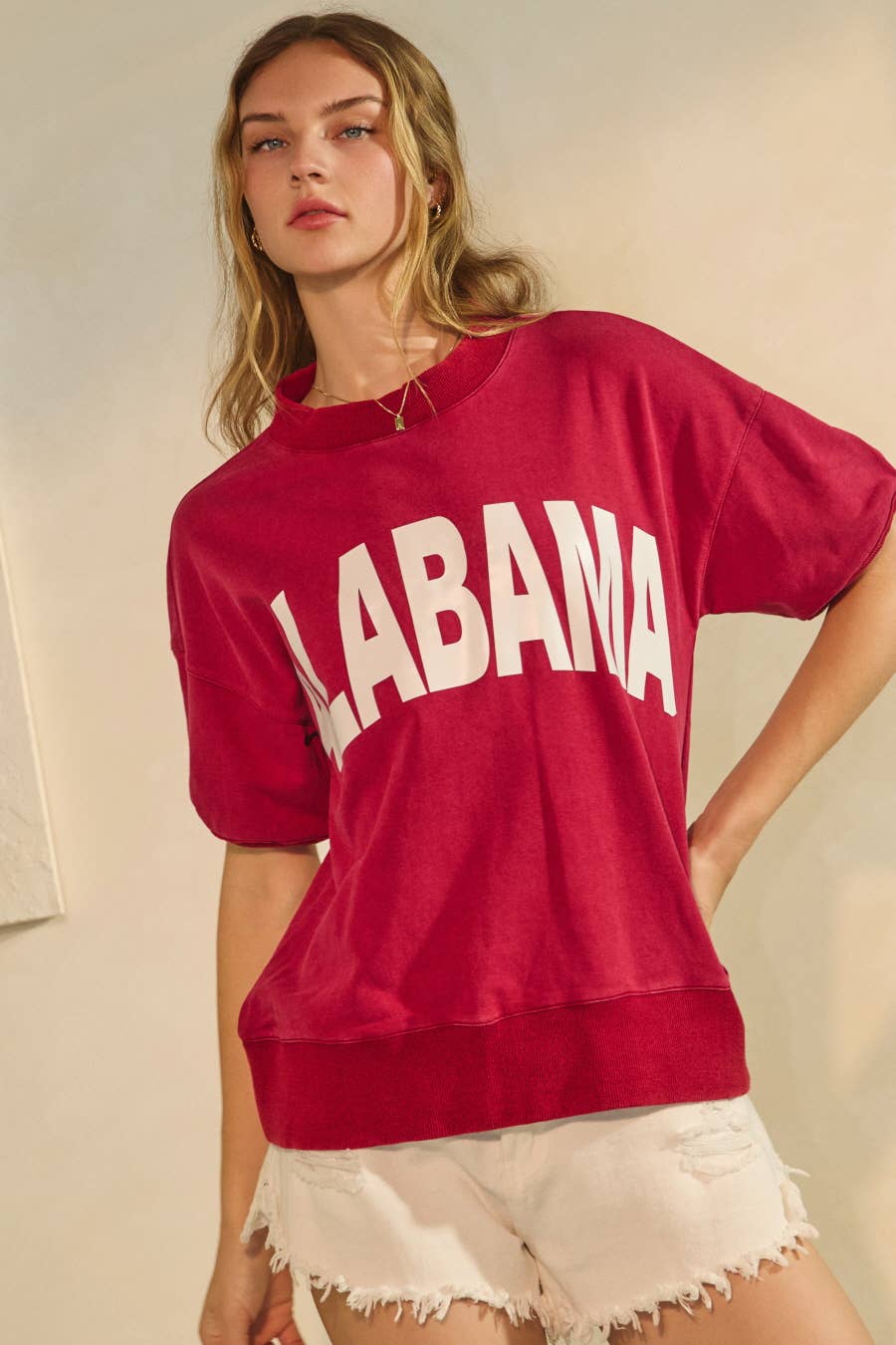Show your team spirit in effortless style with this comfy acid-washed sweatshirt top! Featuring a bold ALABAMA graphic across the chest, this short sleeve pullover is perfect for game days, casual outings, or lounging in laid-back comfort.
