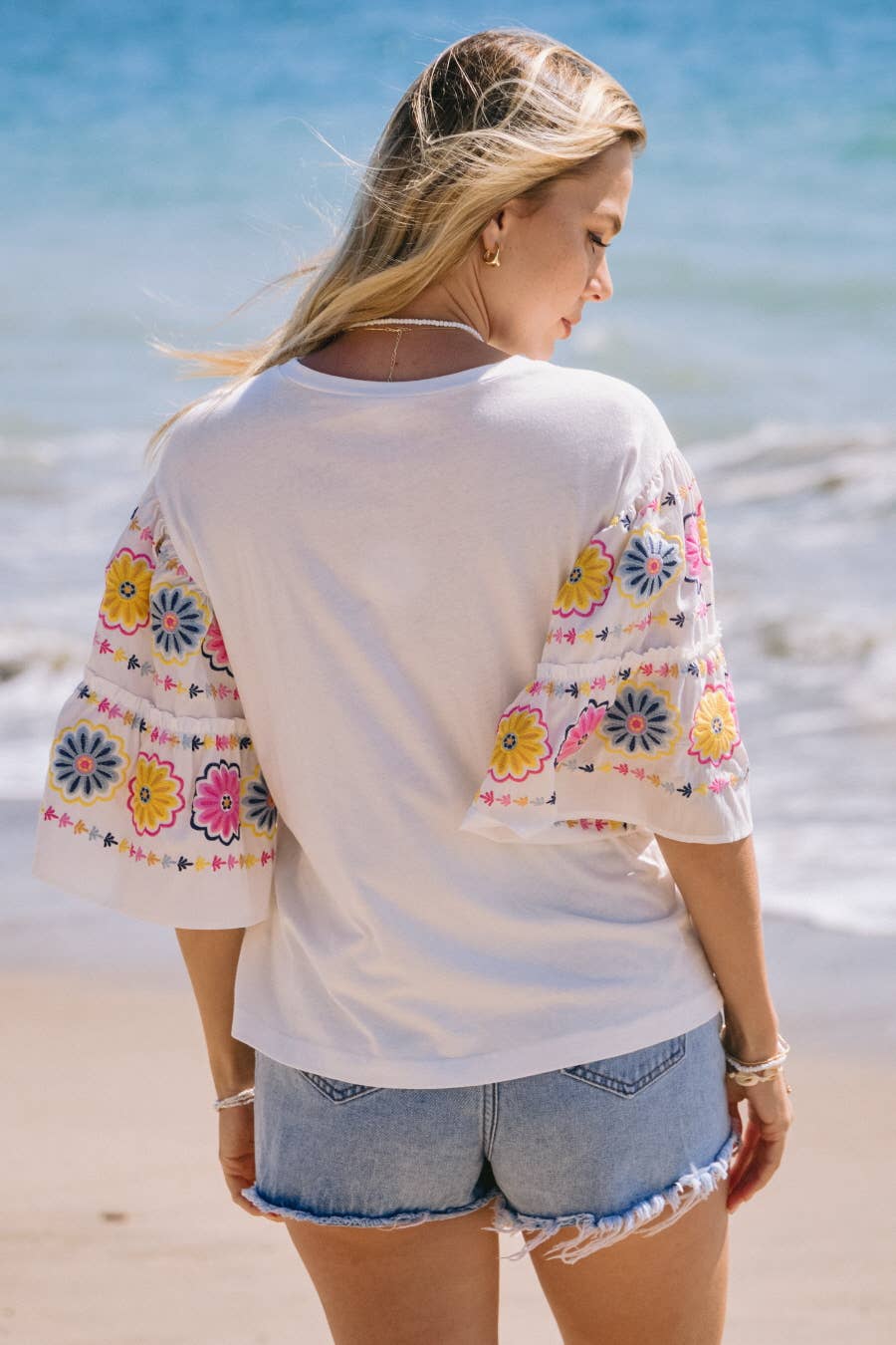 Embroidered tiered ruffle elbow sleeve top featuring round neckline. 100% Cotton