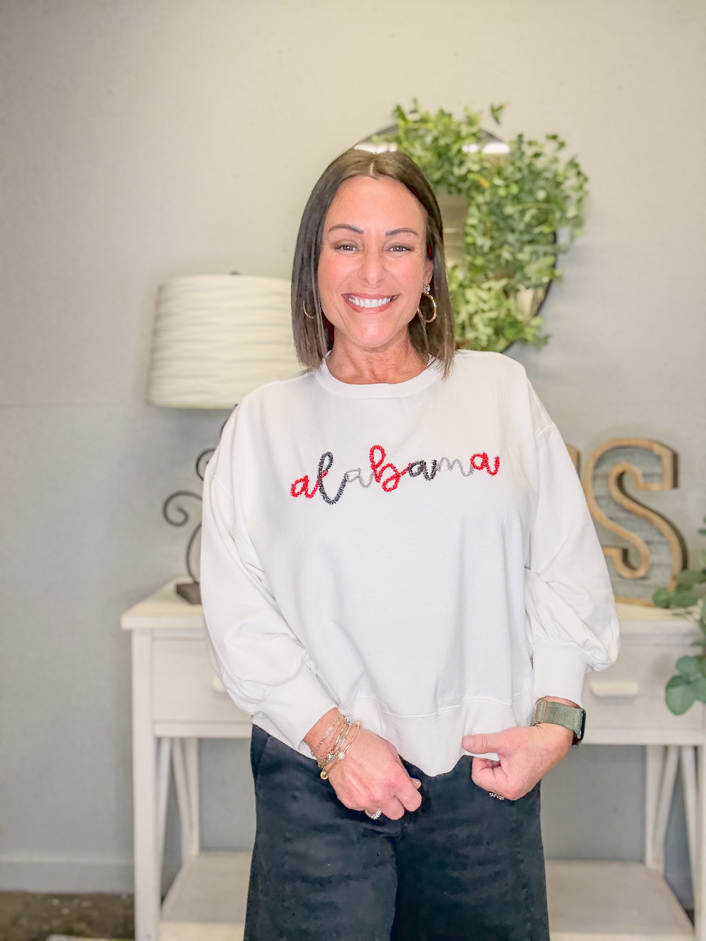 This ultra-soft sweatshirt features an oversized, relaxed fit with the word "alabama" embroidered across the chest in on-trend red, black, and silver metallic script. The soft brushed interior lining feels like a warm hug, while the ribbed banding at the hem and cuffs adds just the right amount of structure.