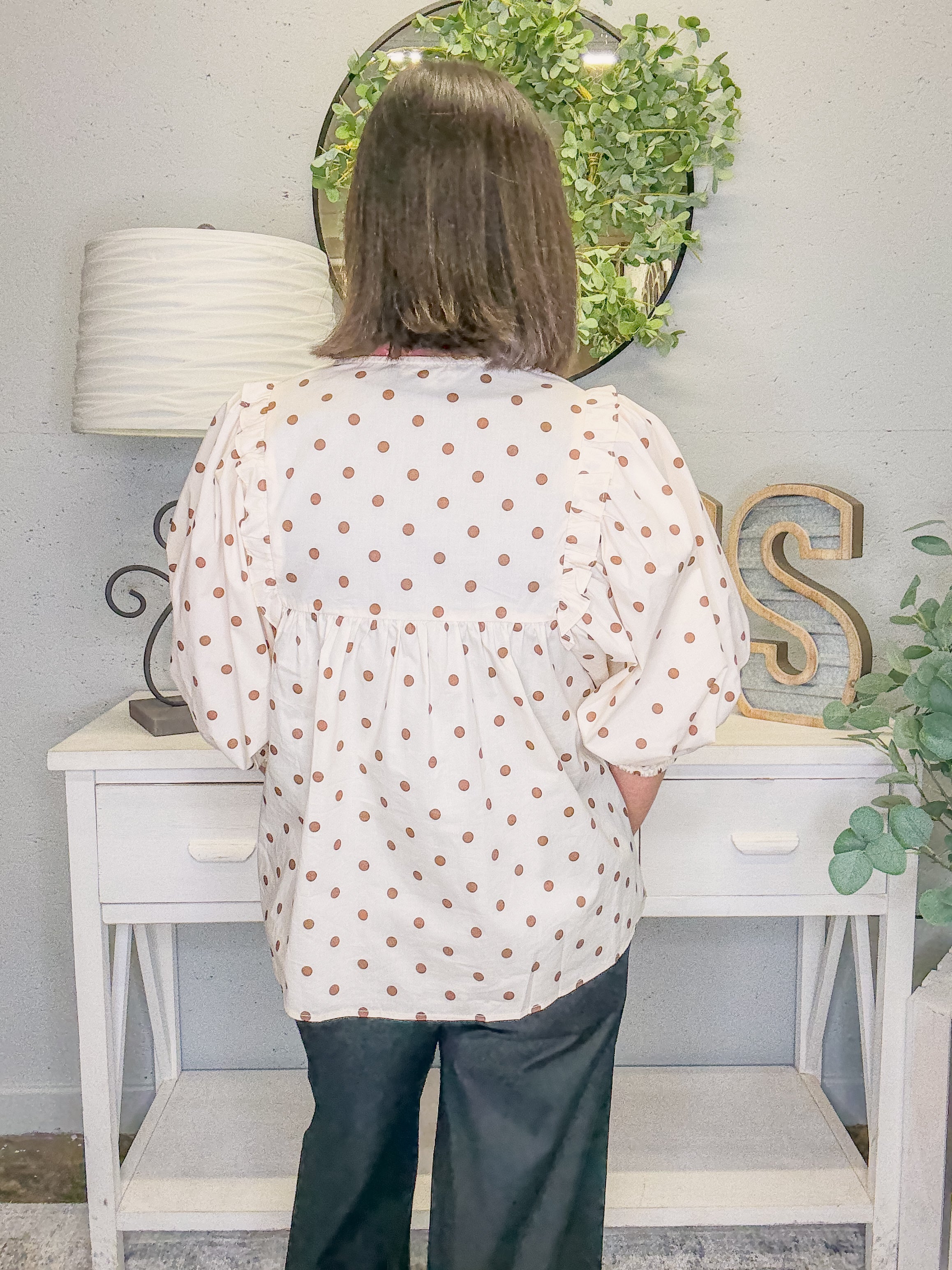 Polka Dot Ruffle Puff Sleeve Blouse – Mocha Cream