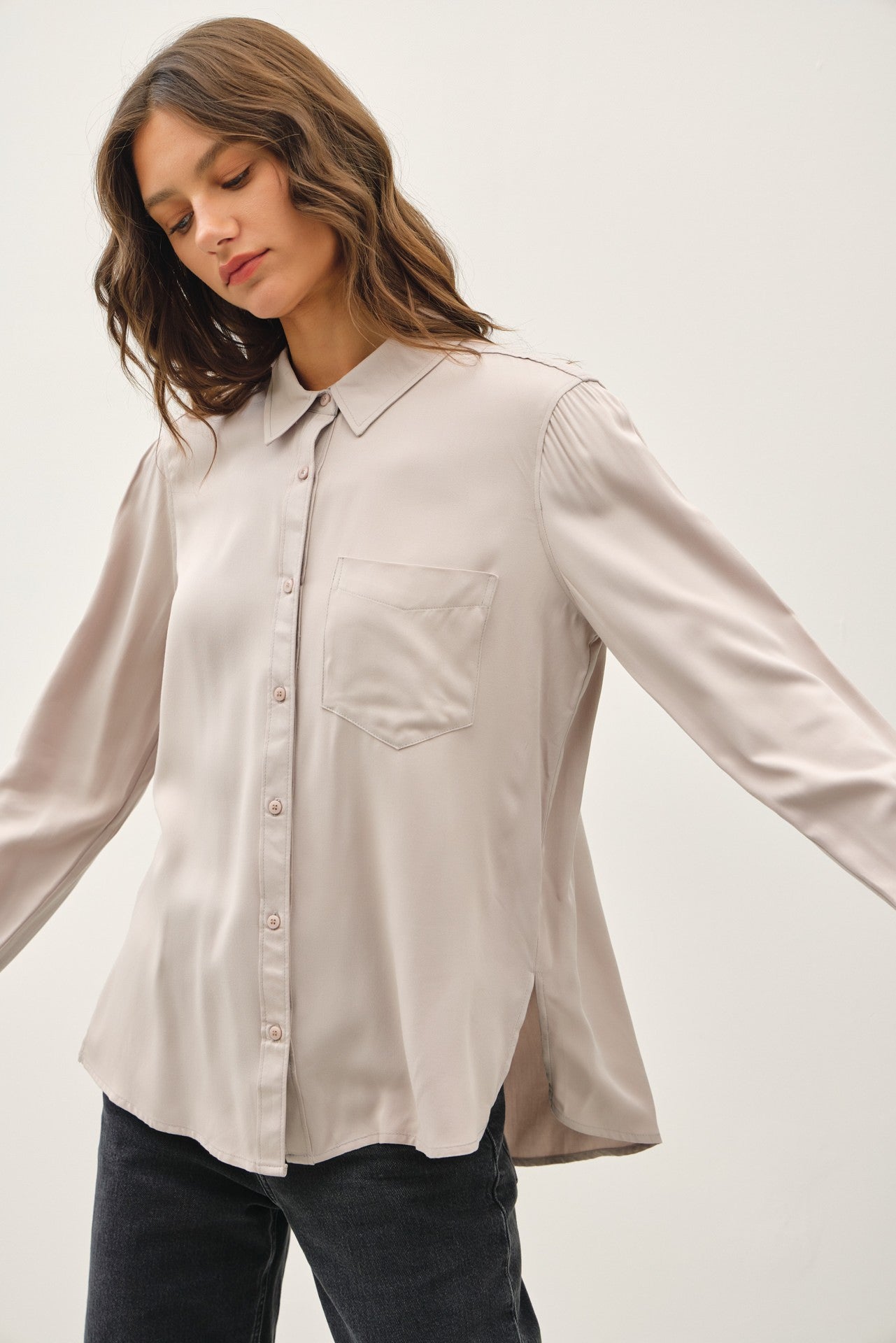 Introducing our Preppy Button Down, the perfect combination of comfort and style. Made with RAYON, this CLASSIC long sleeve shirt features a BUTTON DOWN design with a SPREAD COLLAR, CUFF, and CHEST POCKET for added sophistication. The SIDE SLIT, BACK YOKE, and HIT BELOW HIP LENGTH create a flattering fit, and the HIGH-LOW HEM adds a touch of elegance. Upgrade your wardrobe with this must-have shirt!