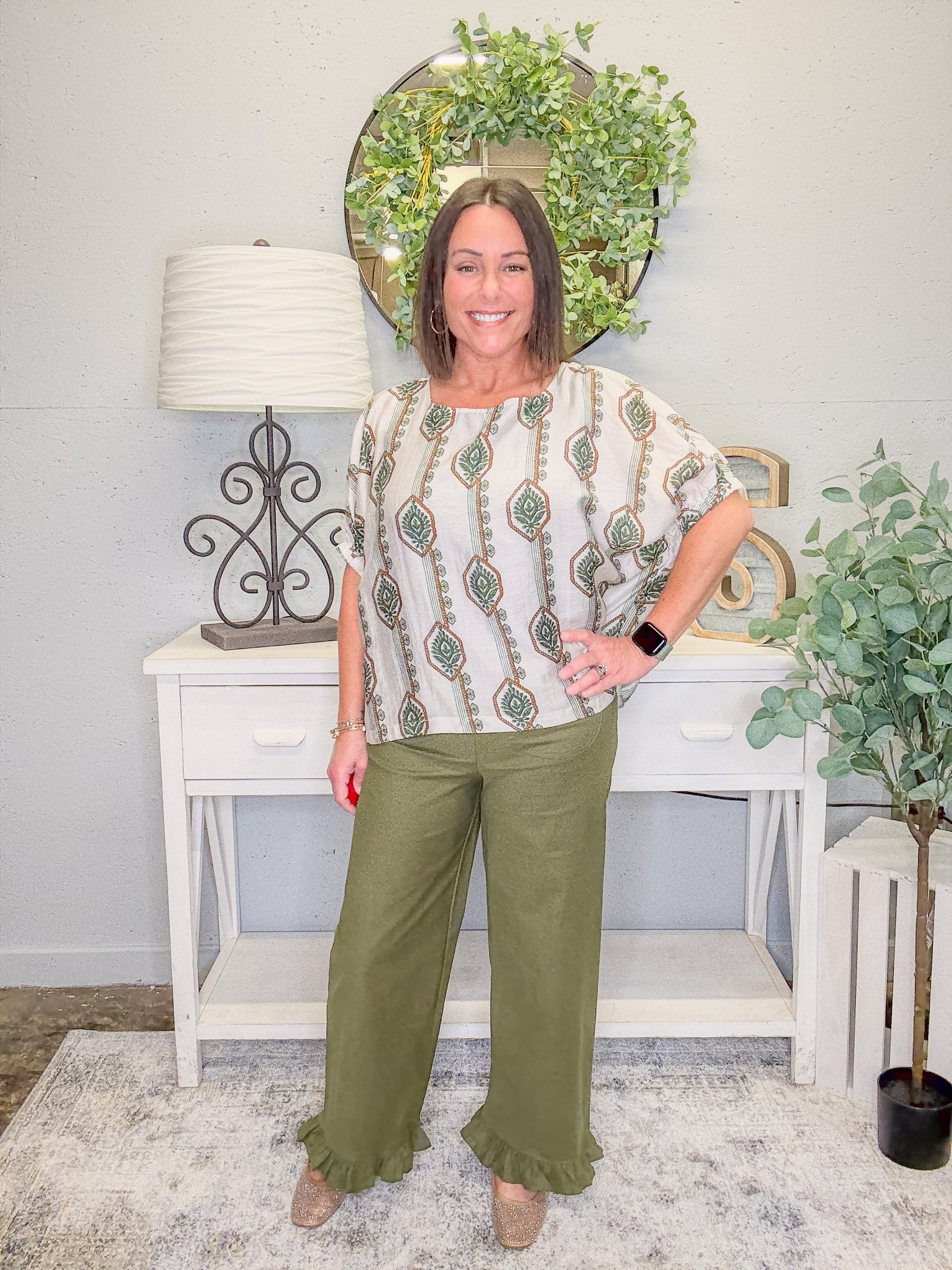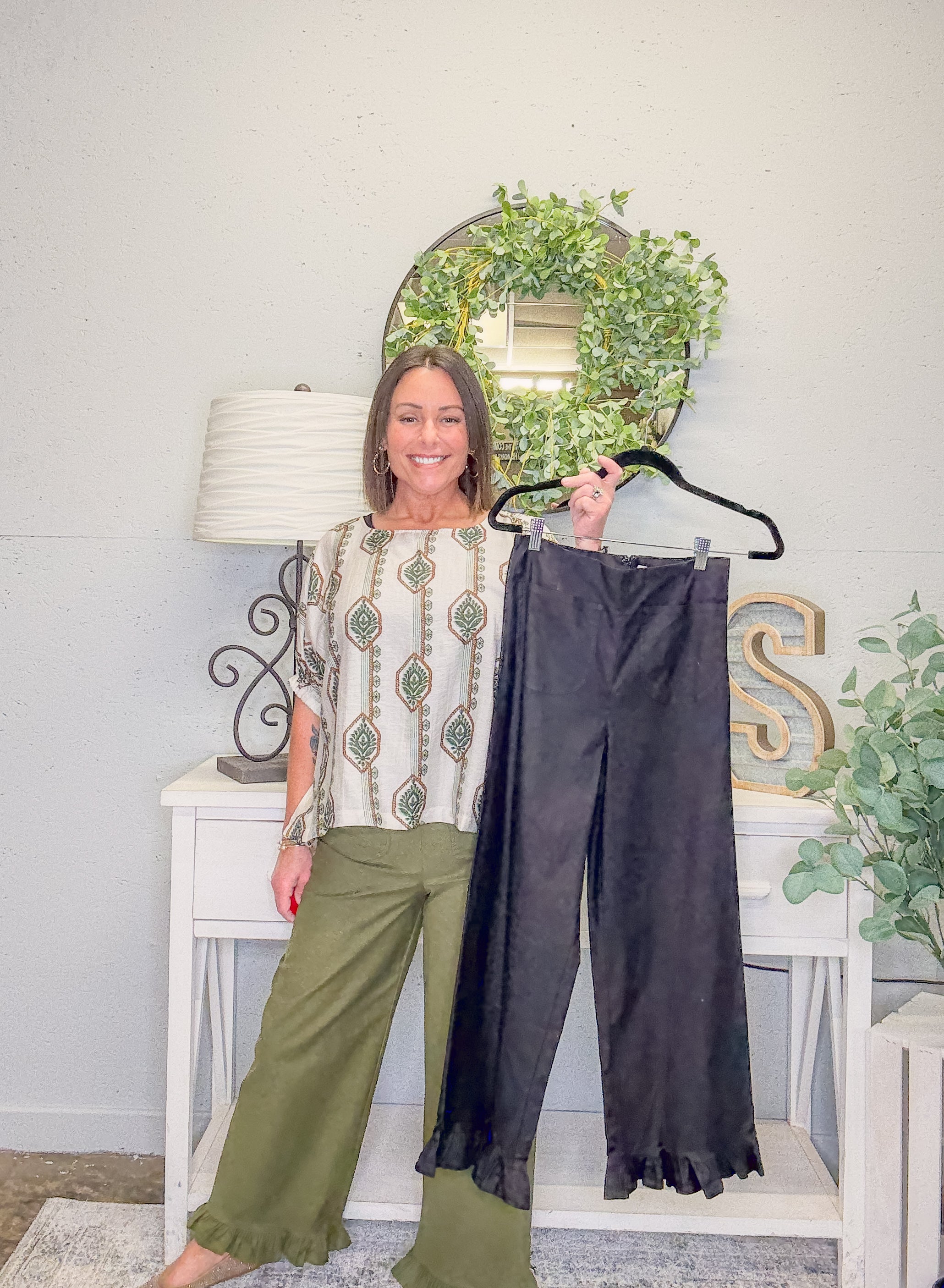 Classic black meets playful charm in these straight-leg pants with a ruffled hem. Featuring a high-waisted fit, functional front patch pockets, and a back zipper closure. Ideal for work, dinner, or weekend style.