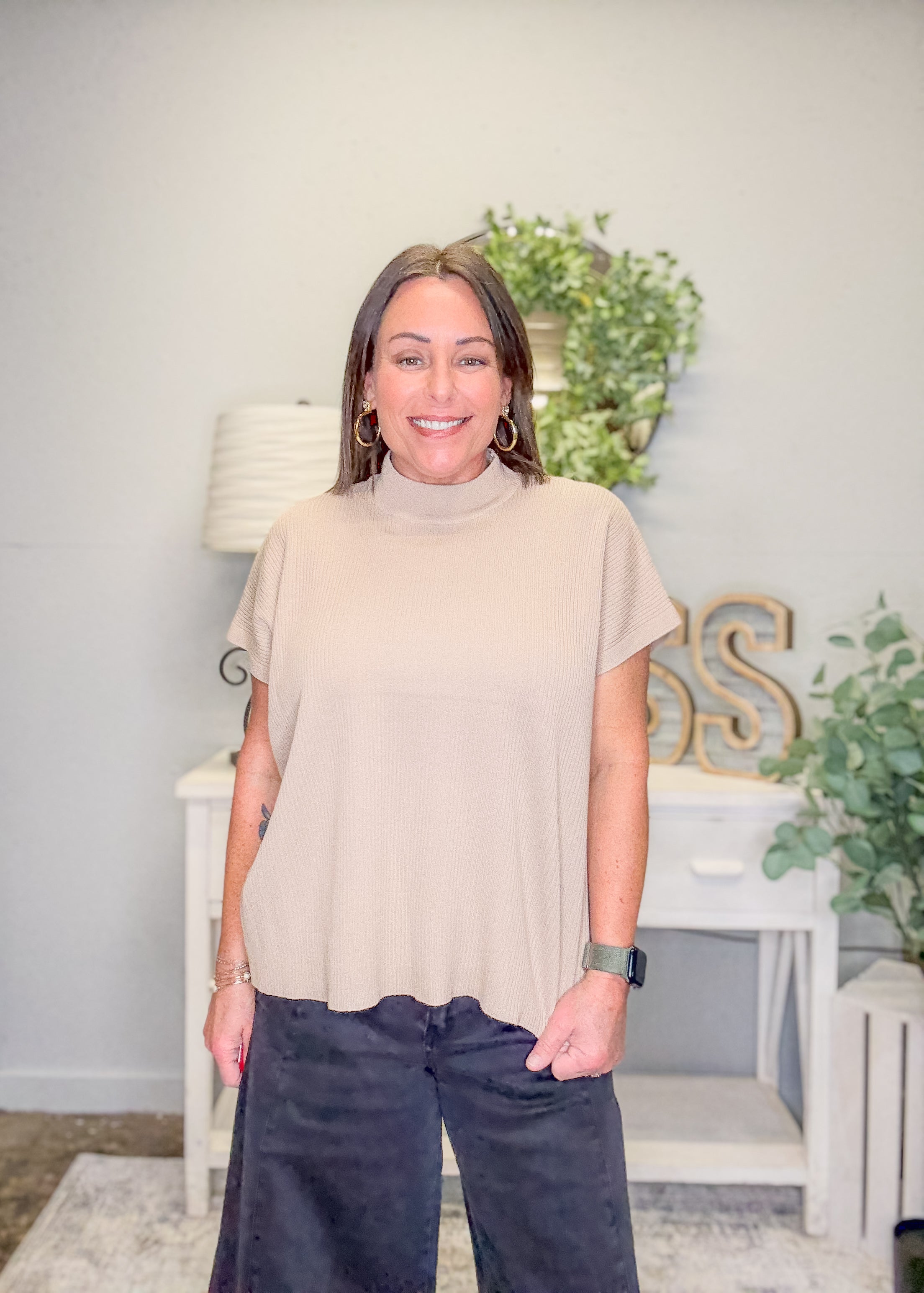 Viscose Mock Neck Short Sleeve Boxy Sweater – Light Mocha