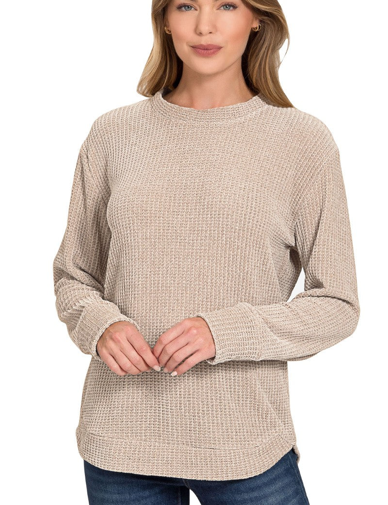 Chenille Waffle Round Neck Sweater – Ash Mocha