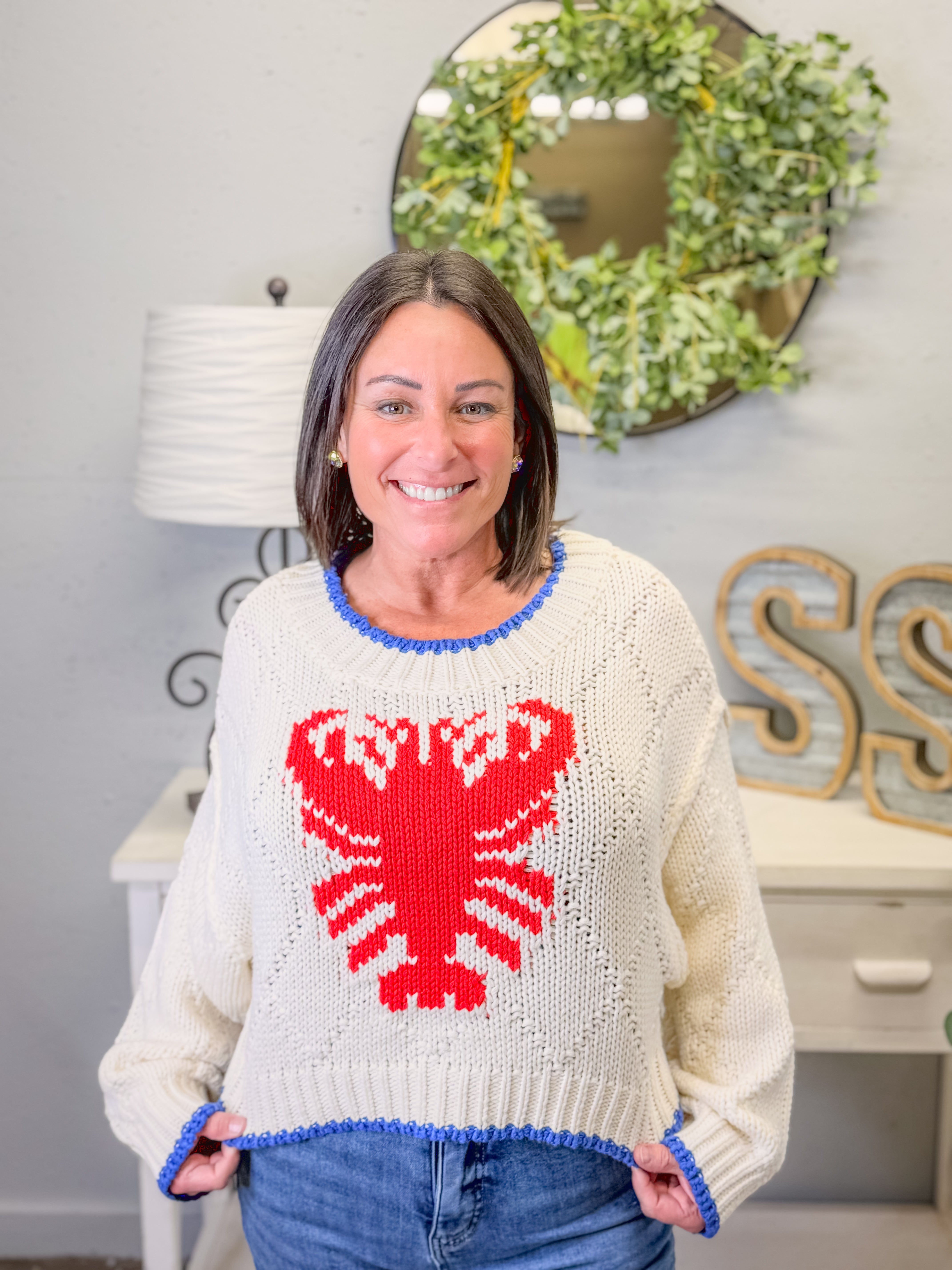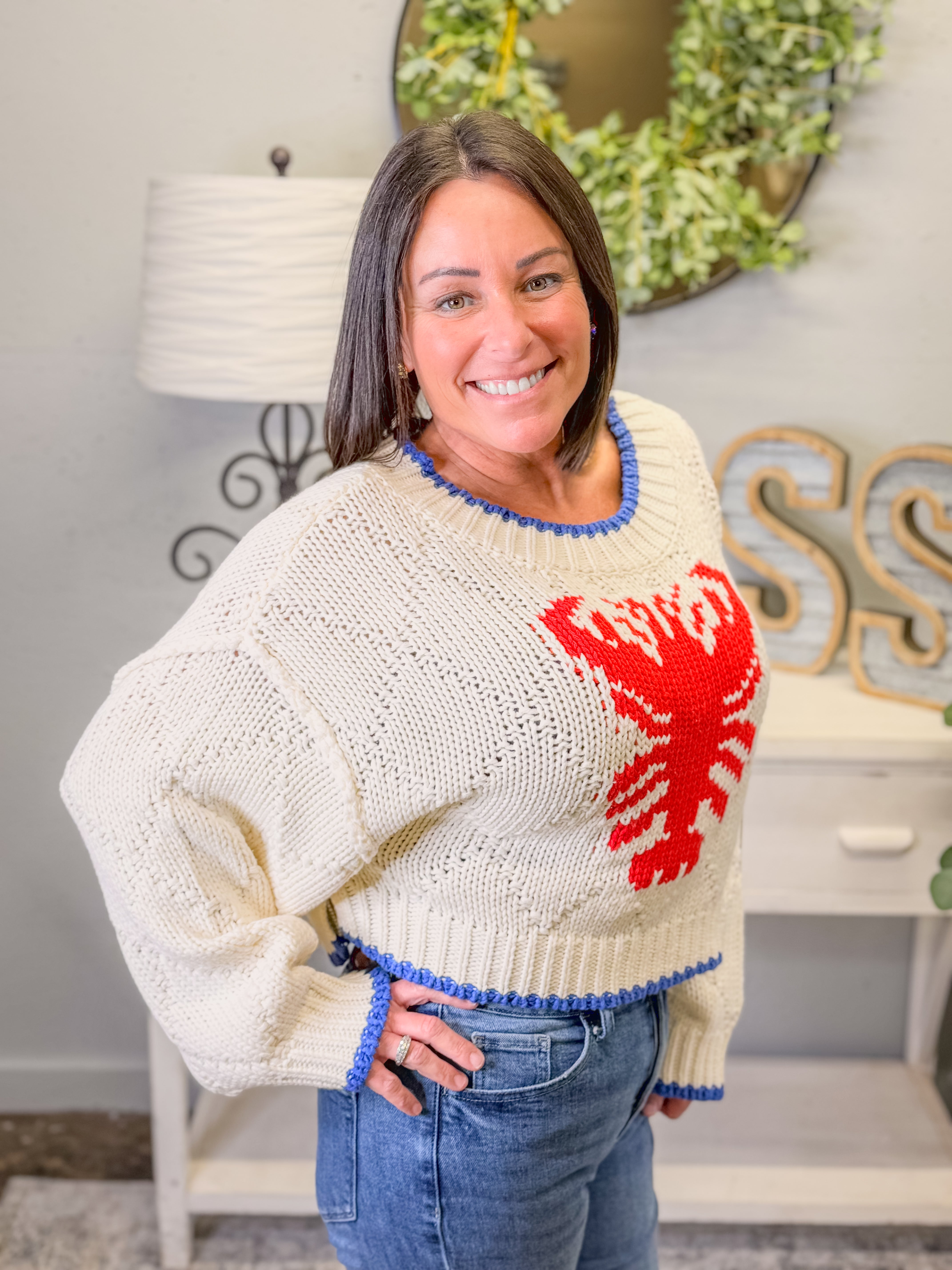 Make a splash with this playful Lobster Intarsia Knit Cropped Sweater! 🦞 Featuring a bold red lobster design on a creamy knit background, this sweater is trimmed with nautical-inspired blue at the collar and hem. The cropped fit and relaxed silhouette make it perfect for pairing with high-rise denim or shorts for a breezy, coastal vibe.