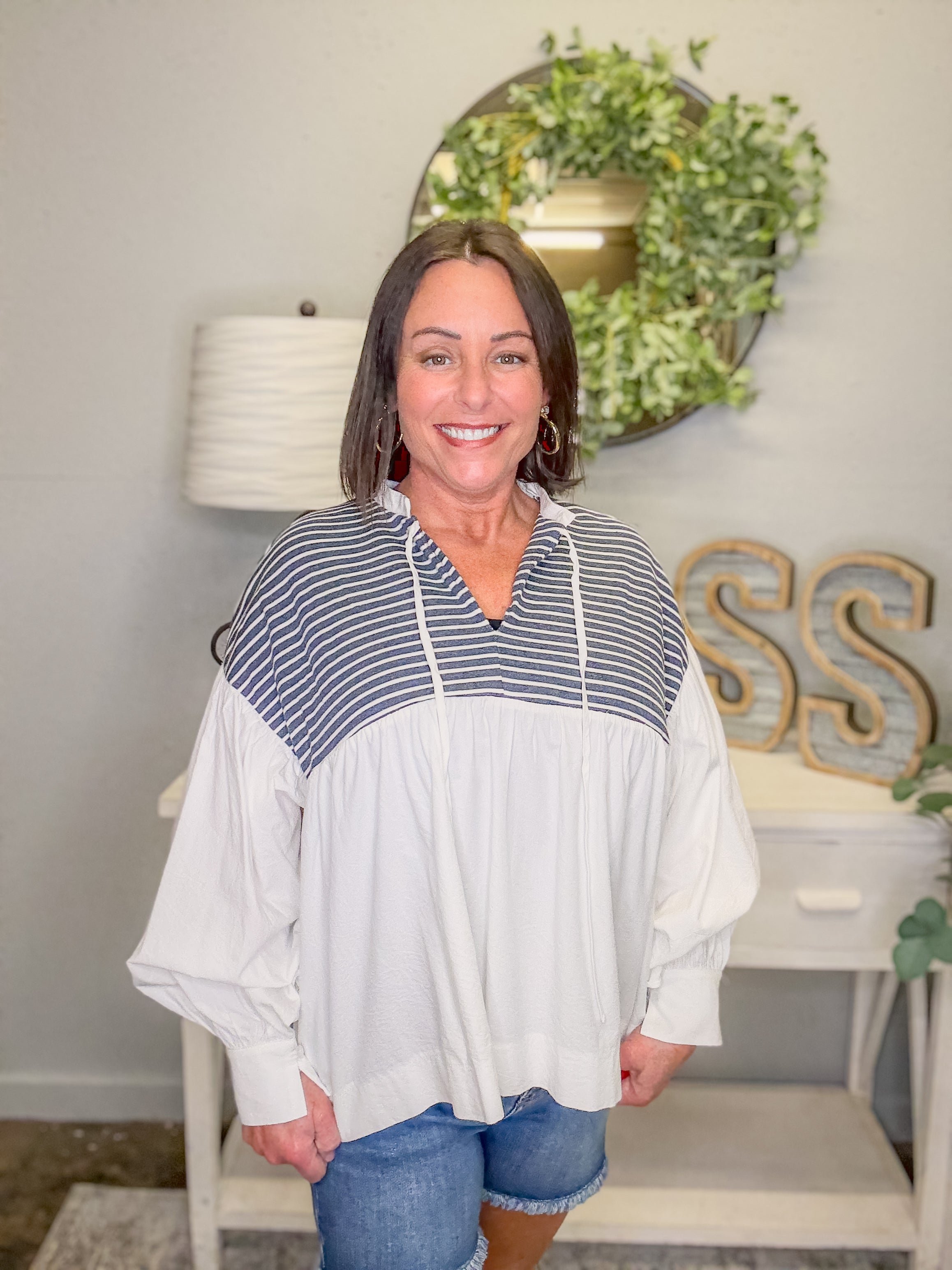 Calling all Auburn fans — the War Eagle Game Day Top is made for your Saturdays on the Plains! This top blends comfort and charm with a front-tie neckline, soft navy and white stripe detail, and billowy long sleeves. Easy to dress up or down, it's the perfect piece for tailgates, campus strolls, or watching the game at your favorite spot.