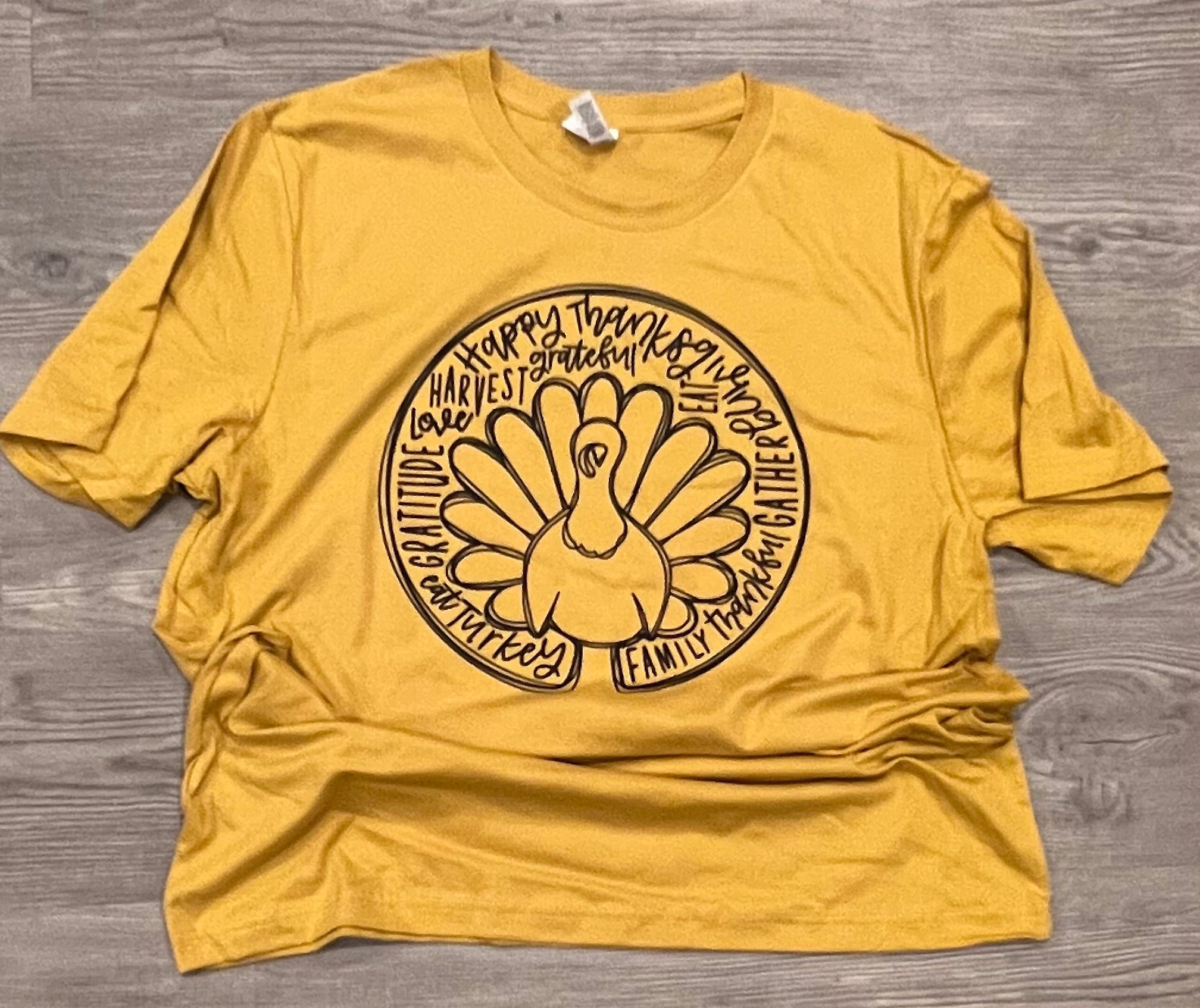 This Gobble Tee features a black turkey printed on a high-quality mustard colored fabric. Celebrate Thanksgiving with a t-shirt that captures all the meanings of the holiday: friendship, family, gratitude, and more. Show your holiday spirit in style!