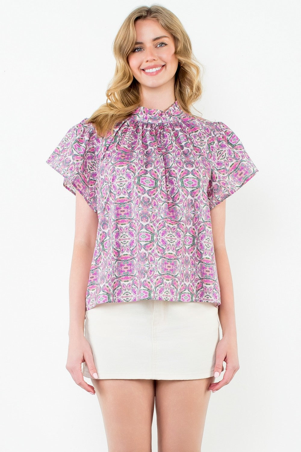Elevate your wardrobe with our Pink Flutter Sleeve Print Top! Designed with flutter sleeves and a vibrant print, this top exudes confidence and style. Made with 100% cotton, it's both comfortable and stylish. Available in a range of sizes, including XS and L, so you can find your perfect fit.