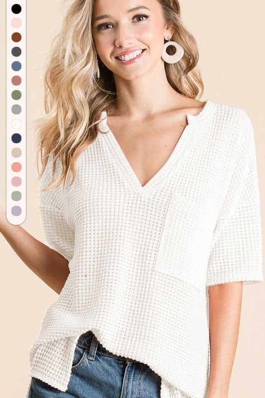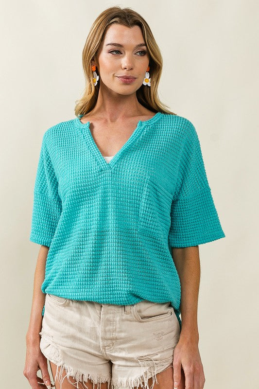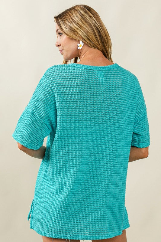 The PoppyWaffle is a unique top designed with a popcorn waffle top and a convenient front pocket. Crafted with a body-flattering fit, this top offers pop-culture style with full functionality. Available in white and turquoise.
