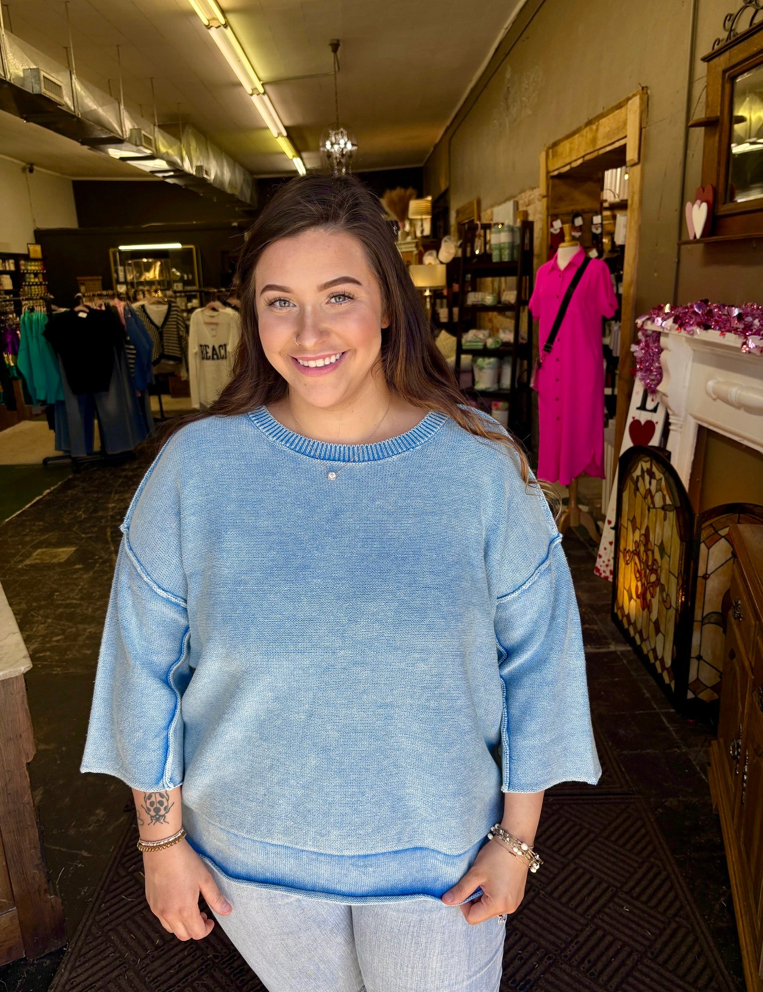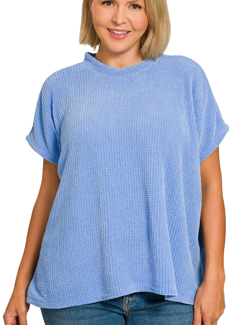 Cornflower Blue Chenille Waffle Cap Sleeve Sweater (Plus)