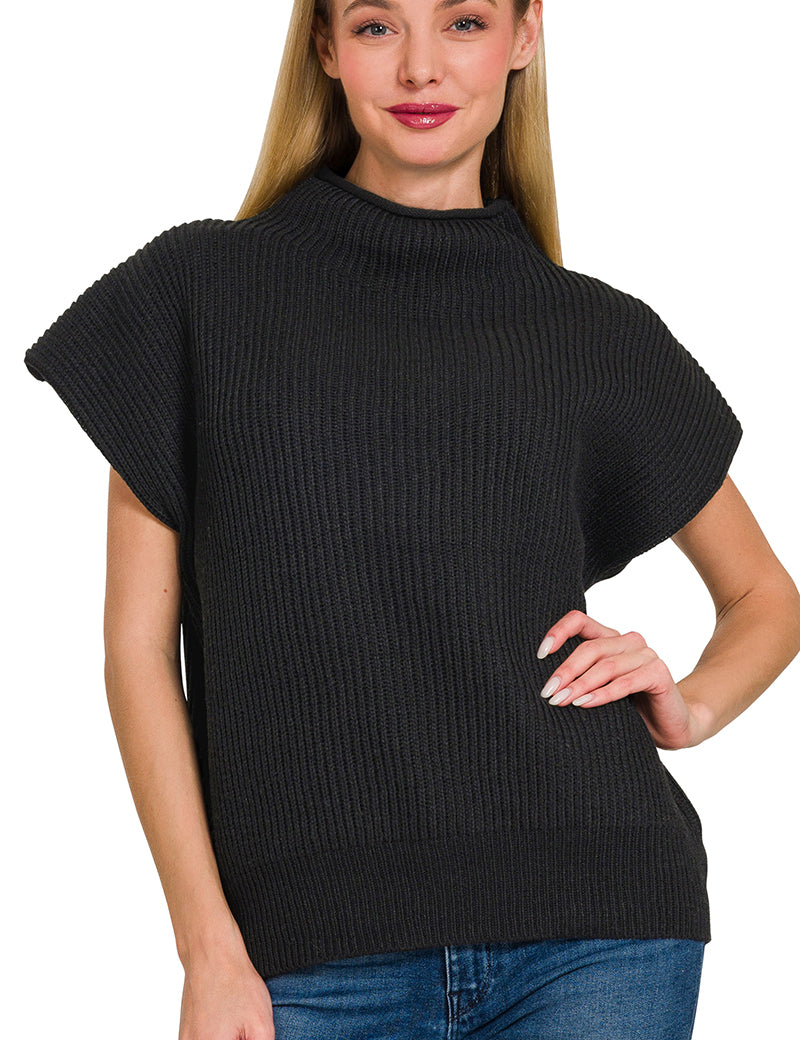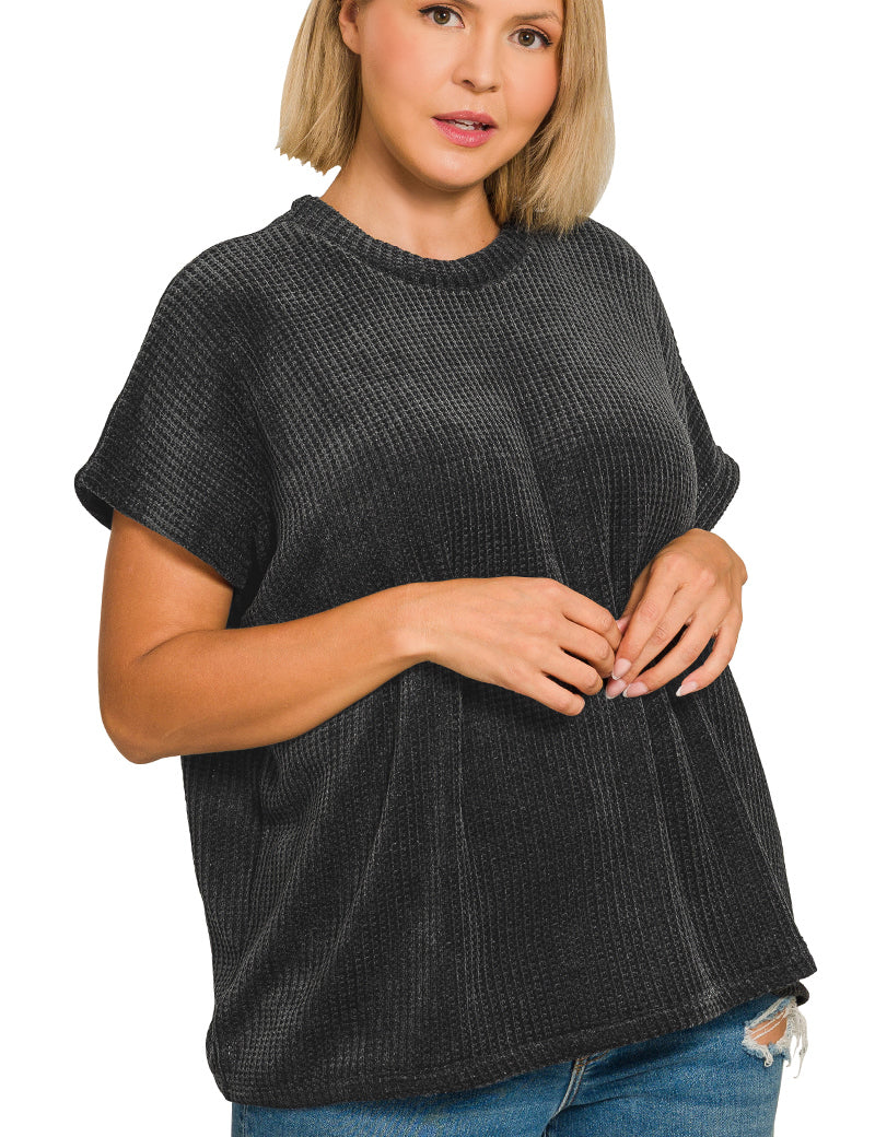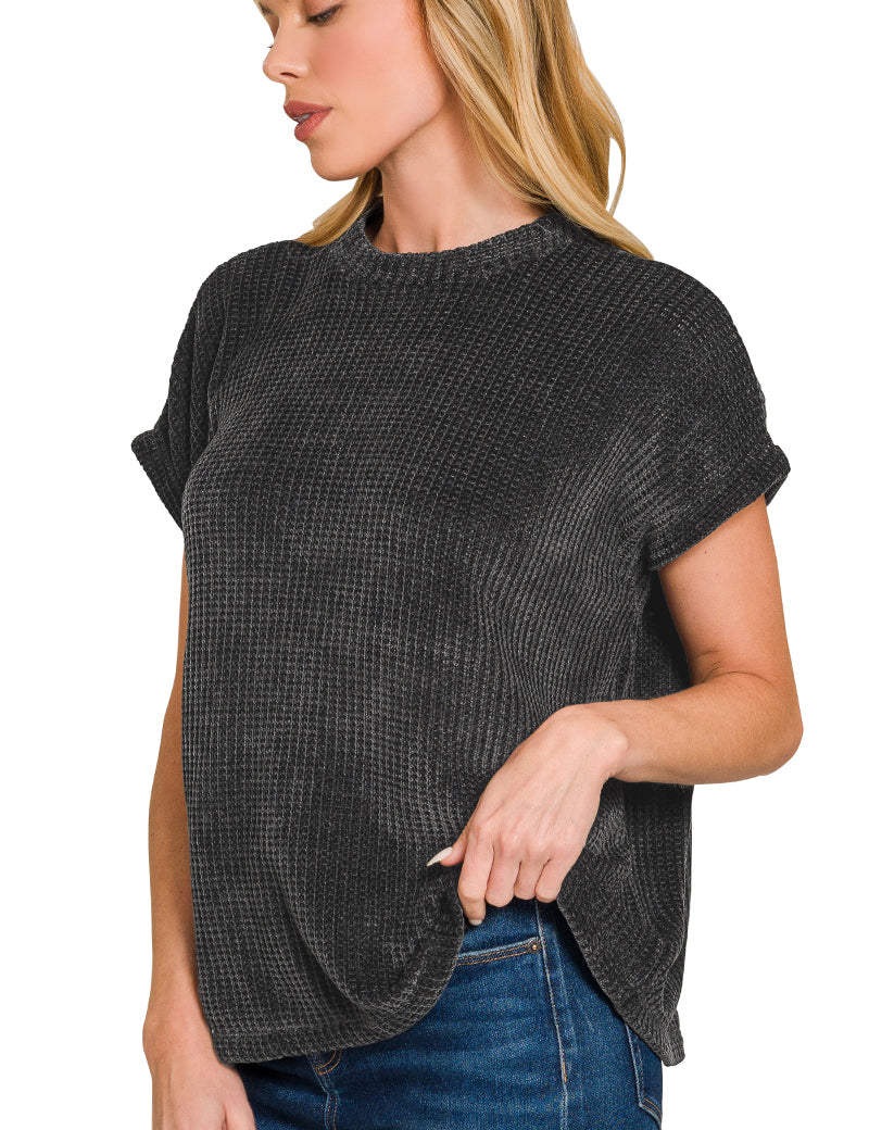 Black Chenille Waffle Cap Sleeve Sweater (Curvy)