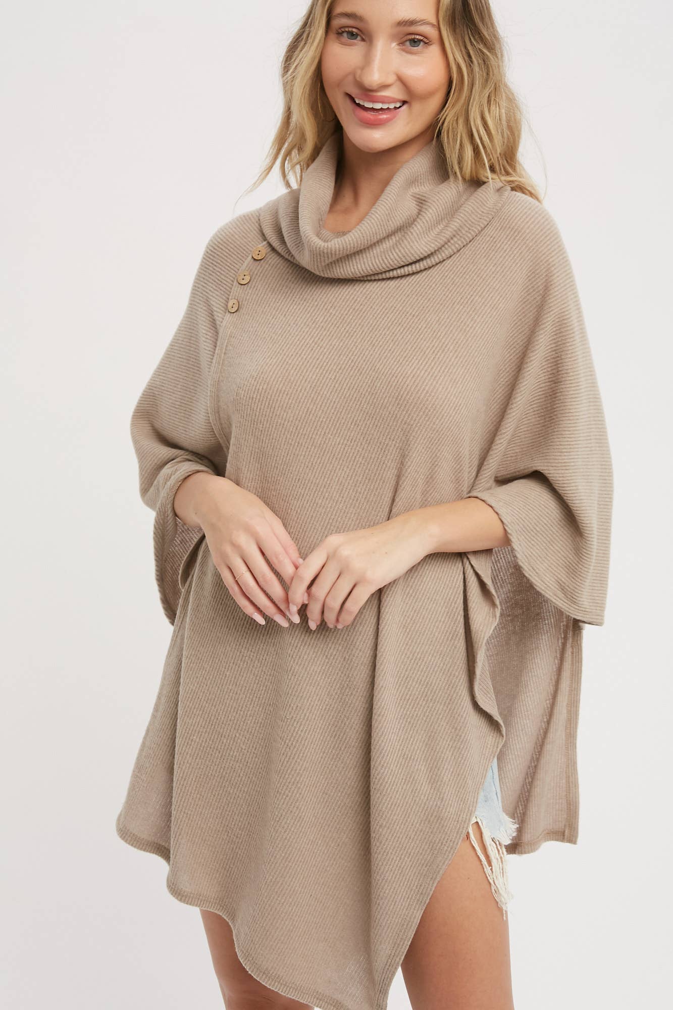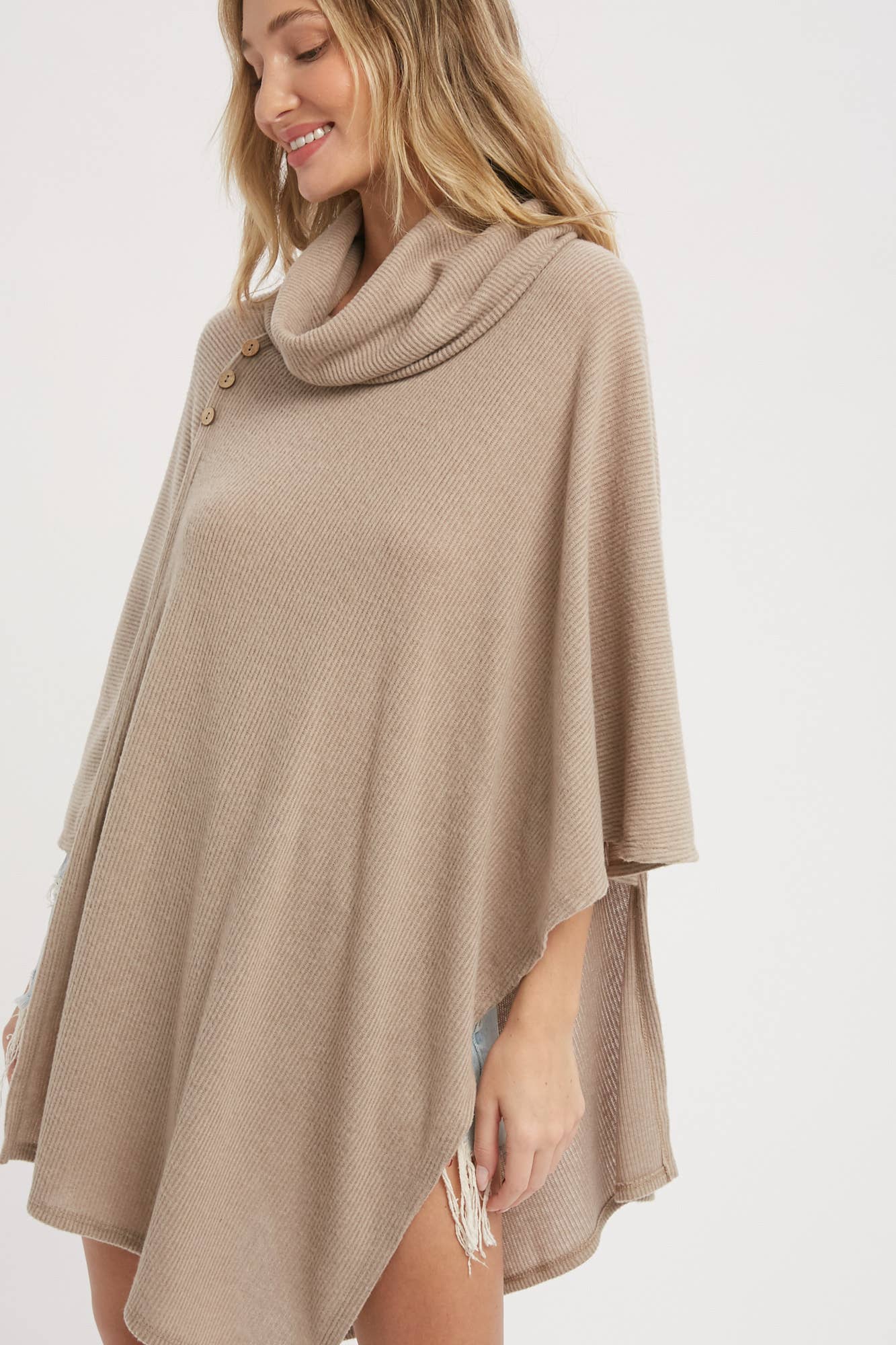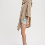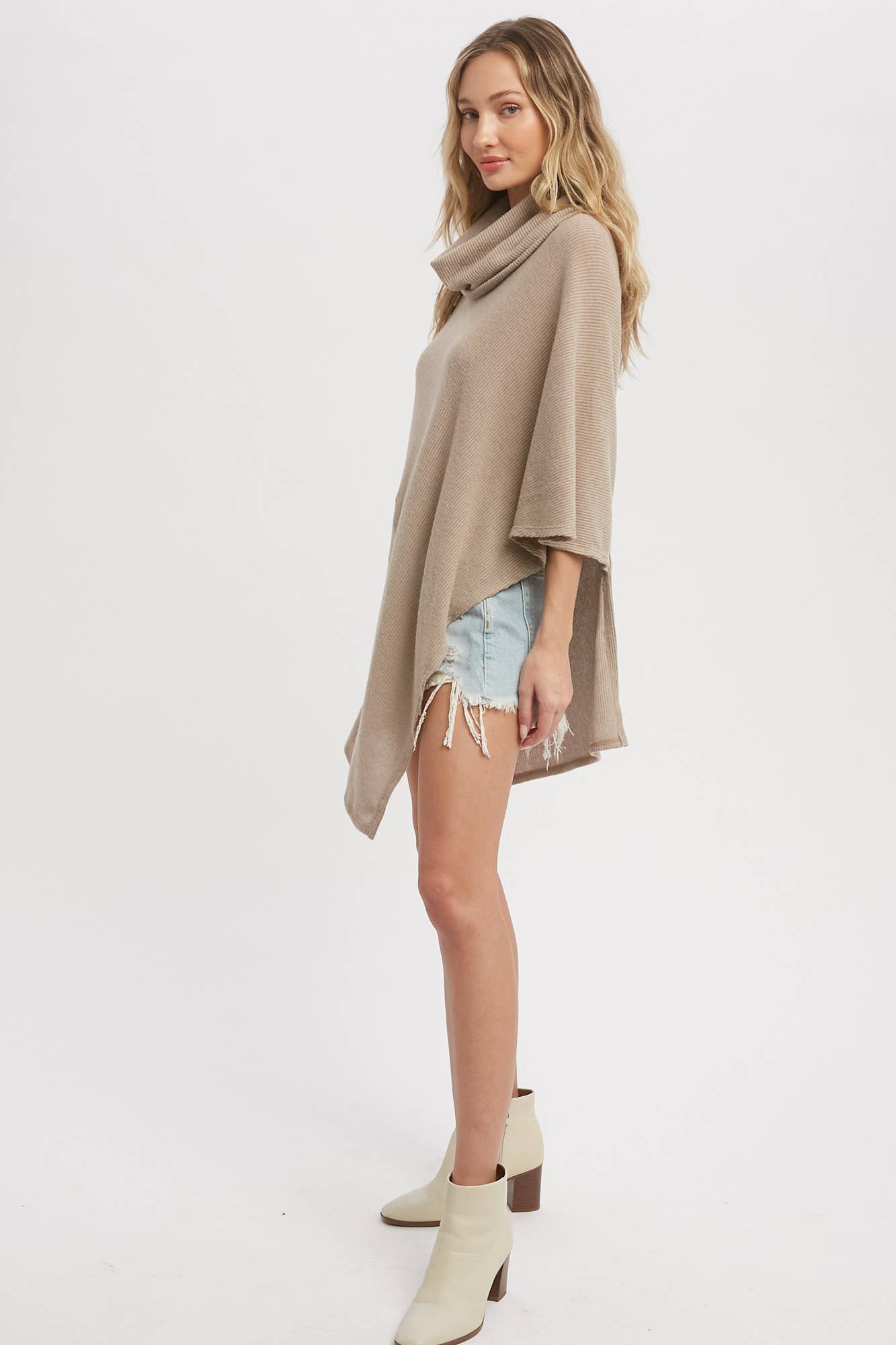 Lightweight knit poncho featuring a cowl neckline, half sleeve, and an asymmetrical silhouette.