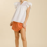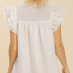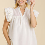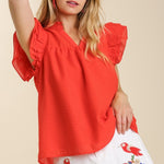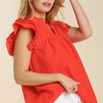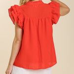 Look chic and stay comfortable with the Basket Bliss top featuring a layered ruffle sleeve and split neckline. Made from basket weave organza fabric, this top comes in tomato and off white in sizes small to large. Enjoy a flattering ruffle hem neckline and enjoy the bliss.