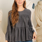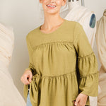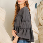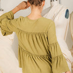 The Bell Babe Top is ideal for a timeless, sophisticated look. The solid woven fabric and tiered structure lend an elegant, structured feel. The round neckline and bell sleeve are detailed with ruffle trim for a feminine touch. Available in olive and charcoal.