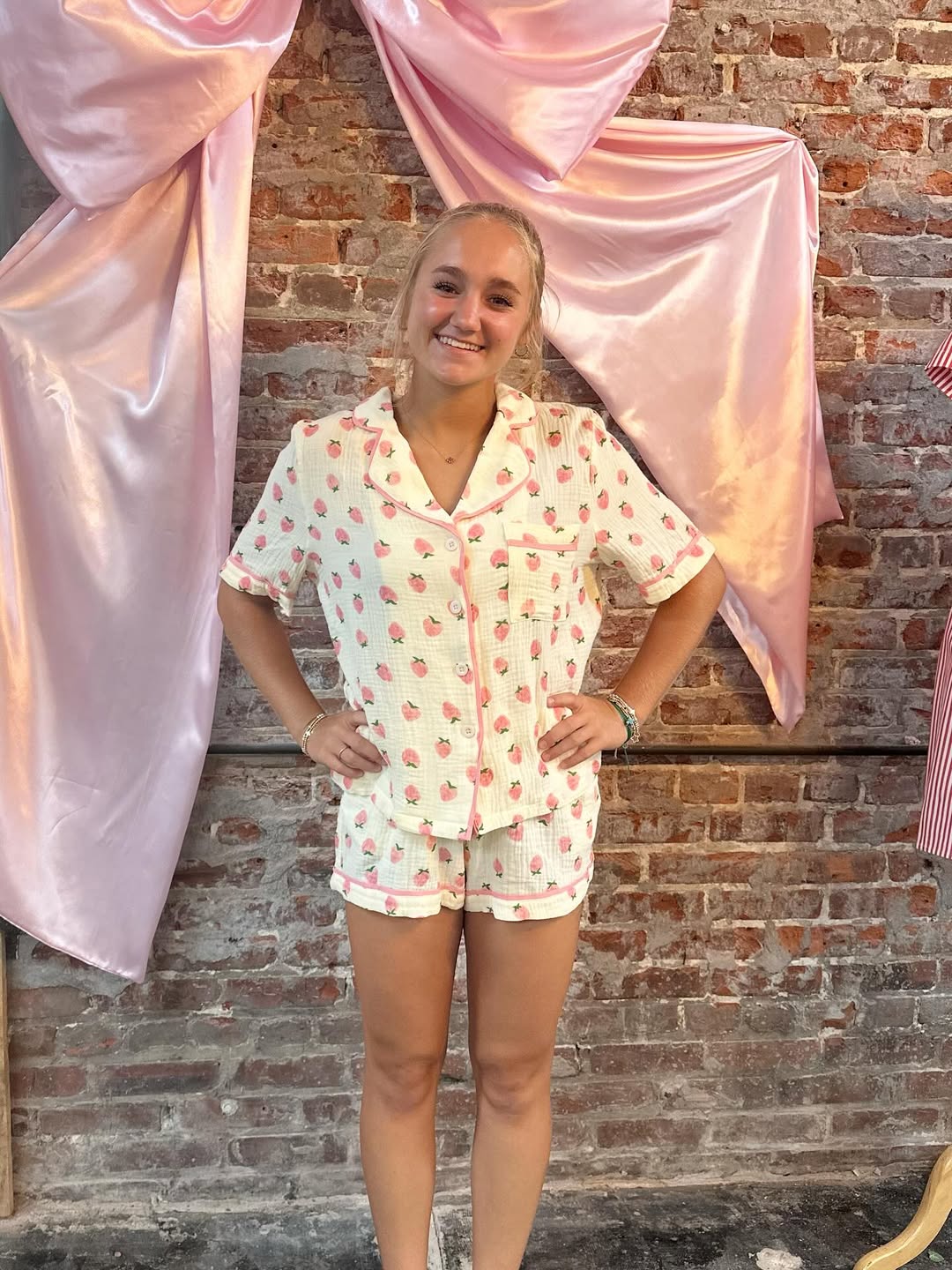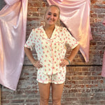 This one's as sweet as it gets! The Berry in Love Lounge Set is made from a dreamy cream-colored double gauze cotton and sprinkled with the cutest pink strawberries. The short sleeve button-up top pairs perfectly with the matching elastic waist shorts, giving you a lightweight and breathable fit that’s just right for summer lounging.