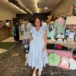 This blue and white striped midi dress is made for sunny days and sweet summer moments! Featuring a flirty ruffle V-neckline, layered ruffle cap sleeves, and a breezy ruffle hem, it's full of feminine, playful charm. The stretchy ruched waistband flatters the waistline, while the non-stretchy cotton blend keeps the structure light and breathable.