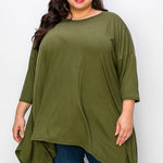 Elevate your look with the Effortless Elegance Side Drape Top in a rich olive hue! This extra plus-size top features a beautiful side drape detail, adding flow and sophistication to a timeless, solid-color design. Available in sizes 3XL-5XL, this piece is perfect for effortless styling with leggings or jeans. Its relaxed fit and soft fabric make it a go-to choice for both comfort and style – a wardrobe essential for any occasion.