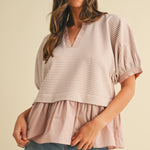 Elevate your style with our Blush Mixed Media Top. The contrasting woven ruffle and textured knit bodice add a unique touch to this top, while the notched neck and voluminous sleeves make a statement. Loose fit for all-day comfort and effortless style. Dare to mix it up!