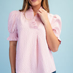 Our Blush Pink Textured V-Neck Top is feminine, flattering, and perfect for spring. Featuring delicate texture throughout, a ruffled V-neck collar, and smocking details along the neckline and sleeves, this top adds subtle dimension while staying effortlessly wearable.