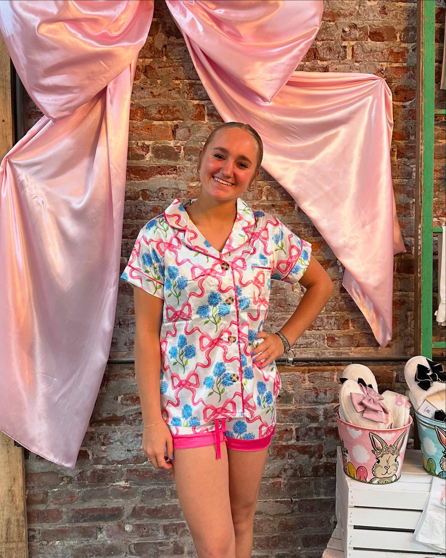 Experience luxurious comfort with this Simply Southern® Ribbon Silky PJ Set! Made of soft and lightweight polyester-spandex blend, this set includes a button-up short sleeve top and matching shorts for a perfect, breathable fit. Elevate your loungewear game with this stylish and comfortable pajama set.