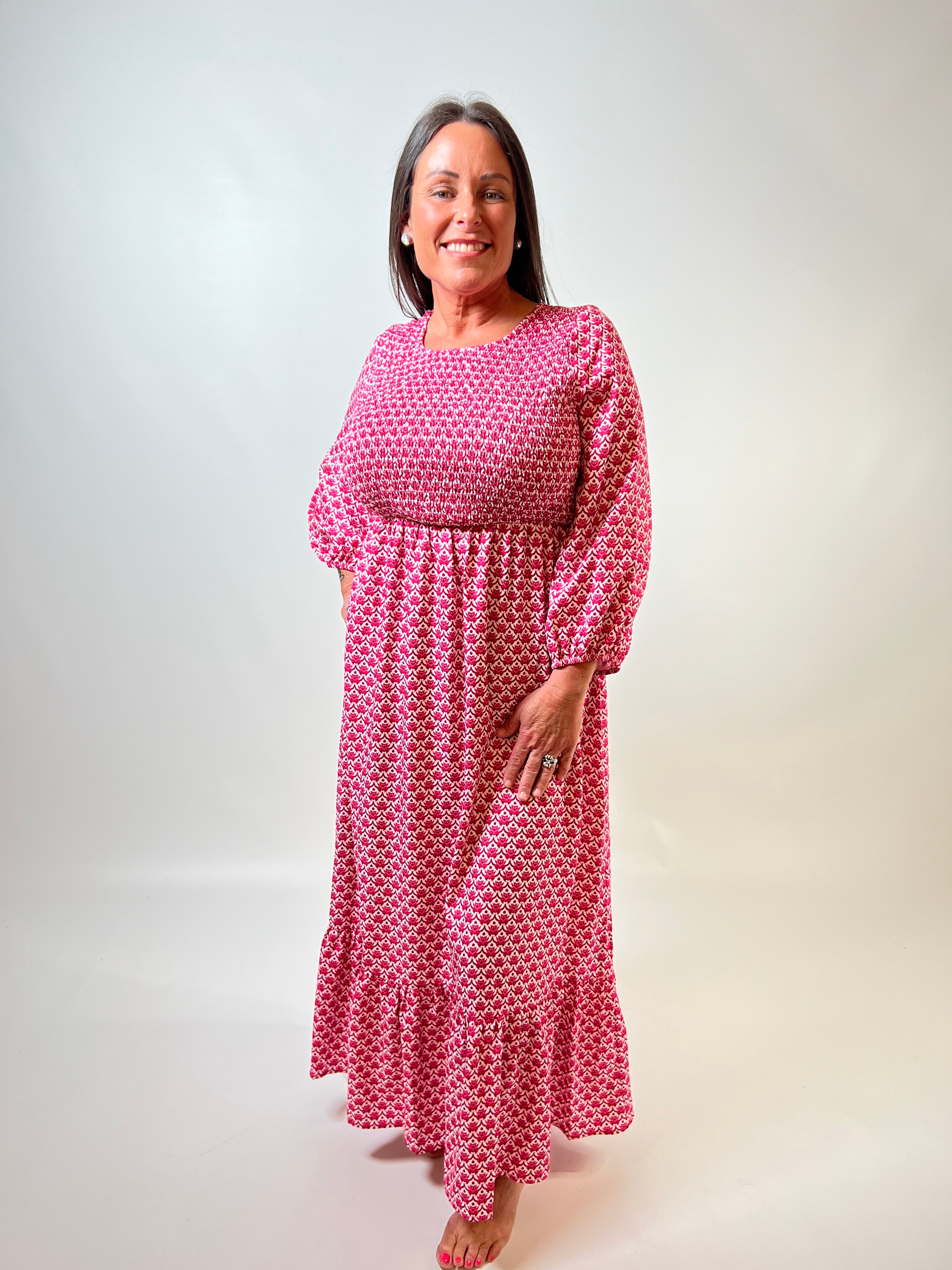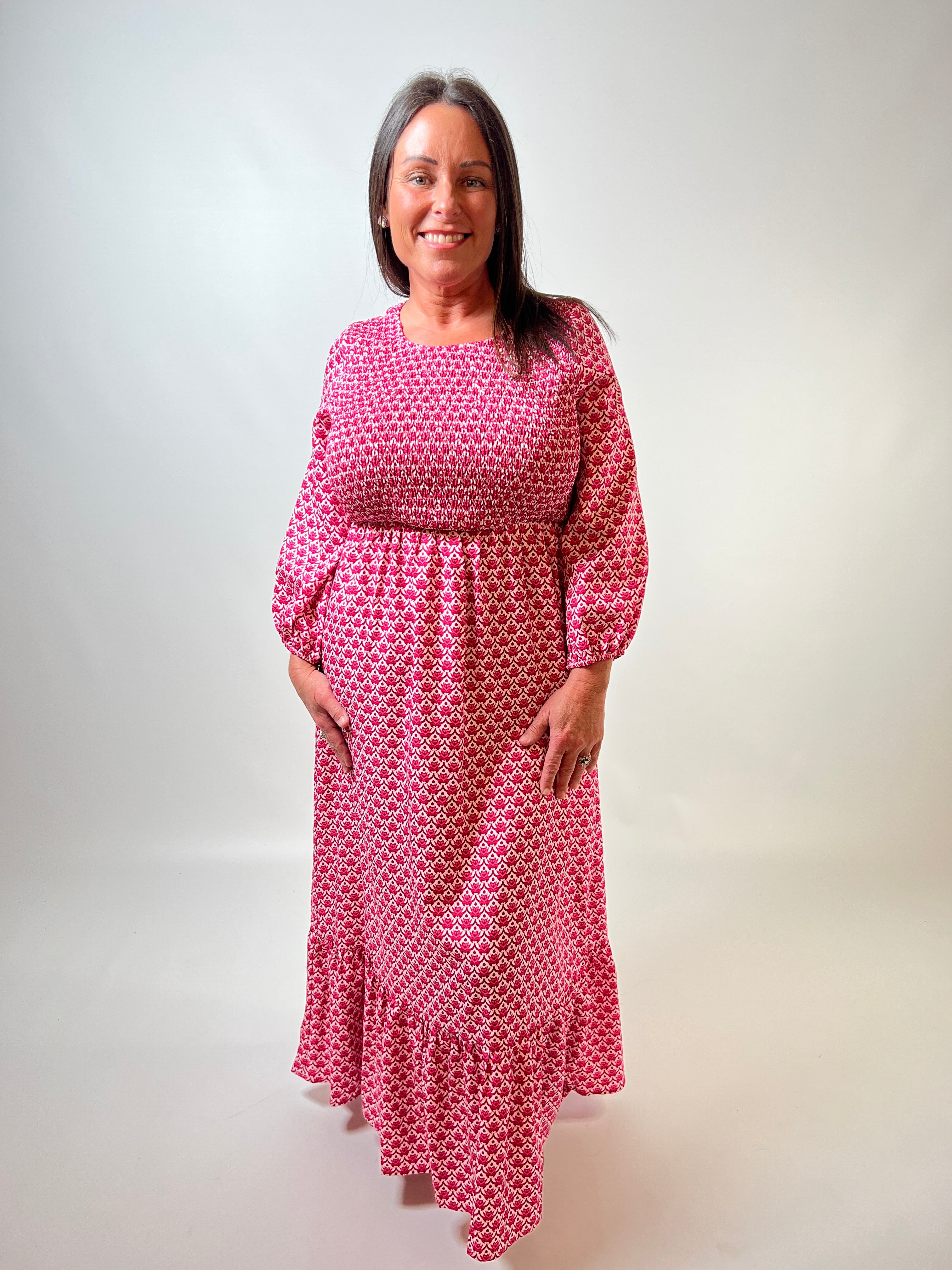 Get ready to turn heads in our Breeze Smocked Maxi Dress! This hot pink flowy dress is designed to flatter with a smocked waist and a flowy maxi silhouette. Available in sizes small to large, this dress is perfect for any occasion. Be bold, be confident, be beautiful!