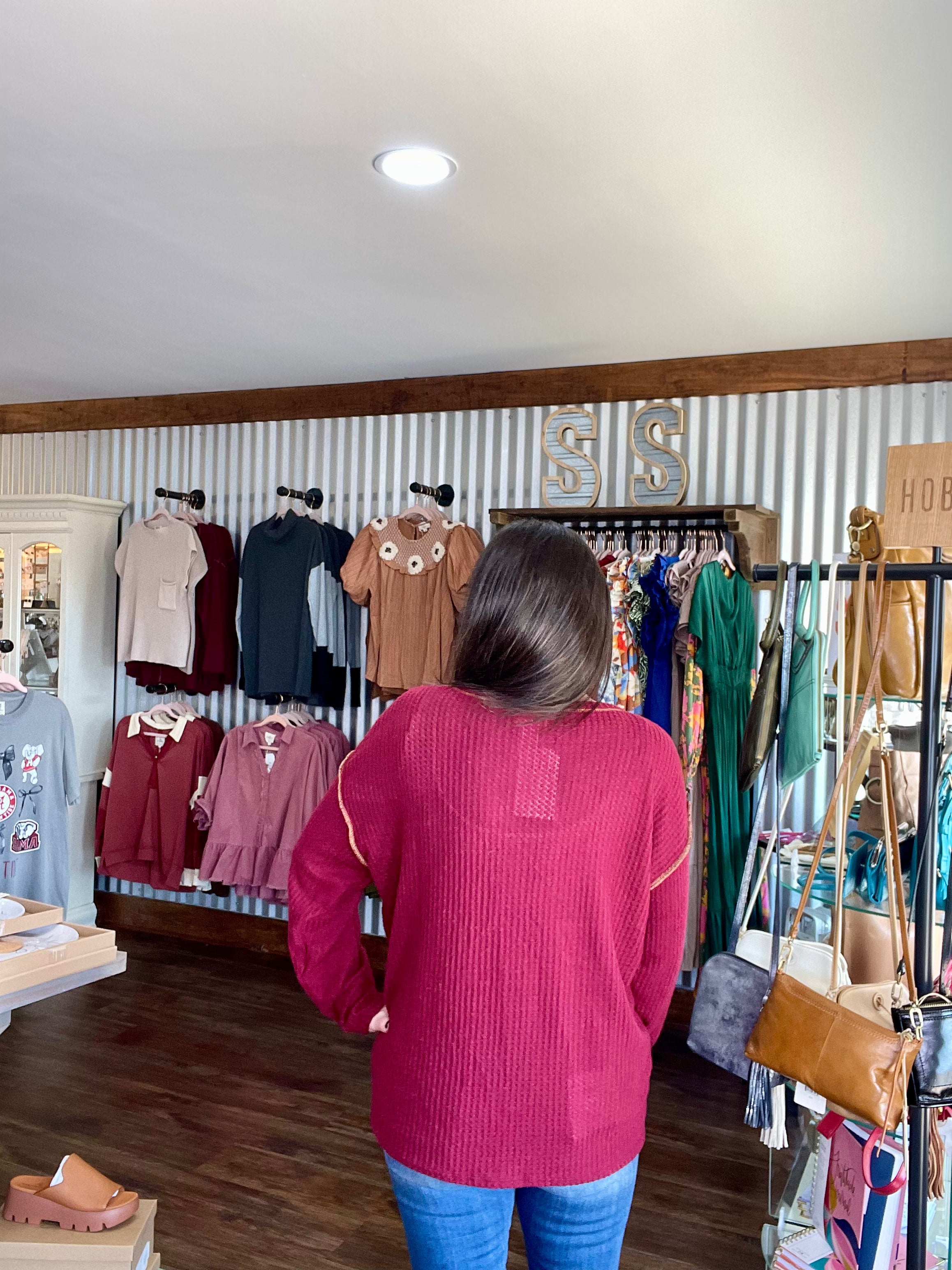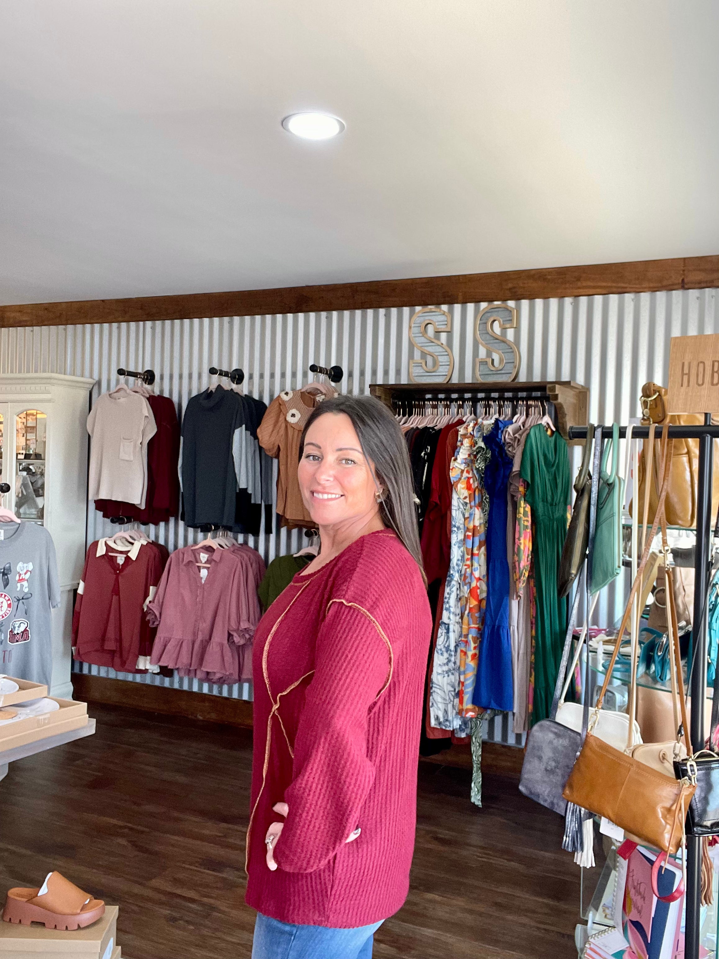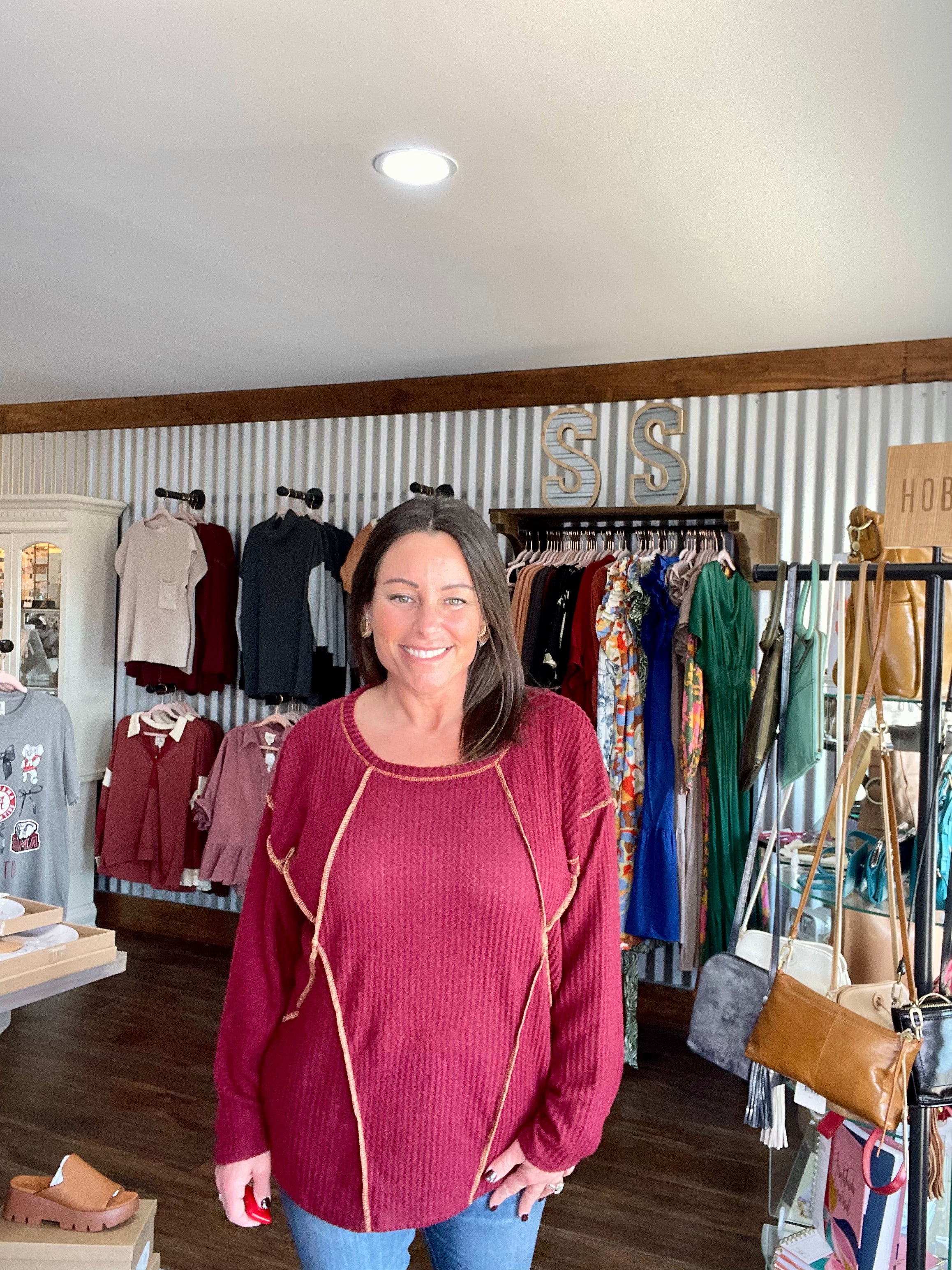 Upgrade your wardrobe with our Burgundy Waffle Knit Top! Made with a soft brushed fabric, this top will keep you cozy and stylish. The reverse stitching detail adds a unique touch to the classic waffle design. Available in sizes small to XL, it's the perfect addition to any outfit.