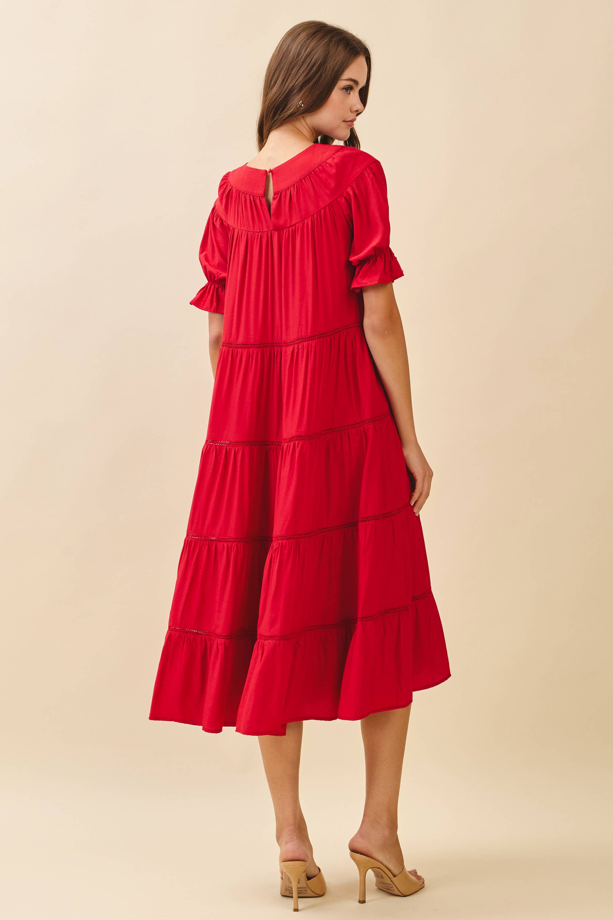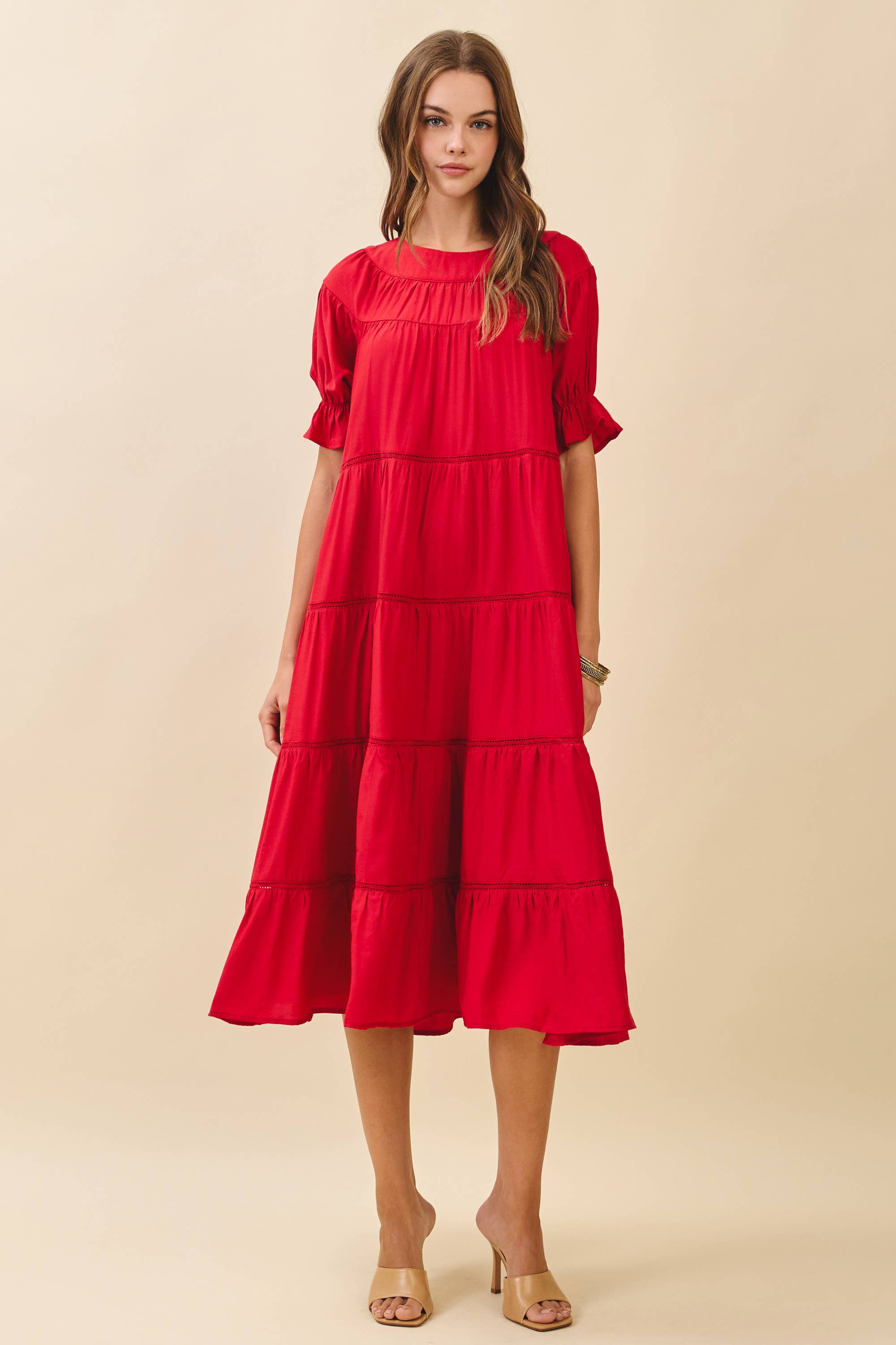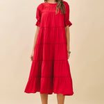 This loose-fitting tiered midi dress is that effortless statement piece your closet has been waiting on. Featuring a classic crew neckline, soft ruffled puff sleeves, and beautifully layered skirt panels with subtle trim detailing — she’s feminine, flowy, and flattering on everyone.