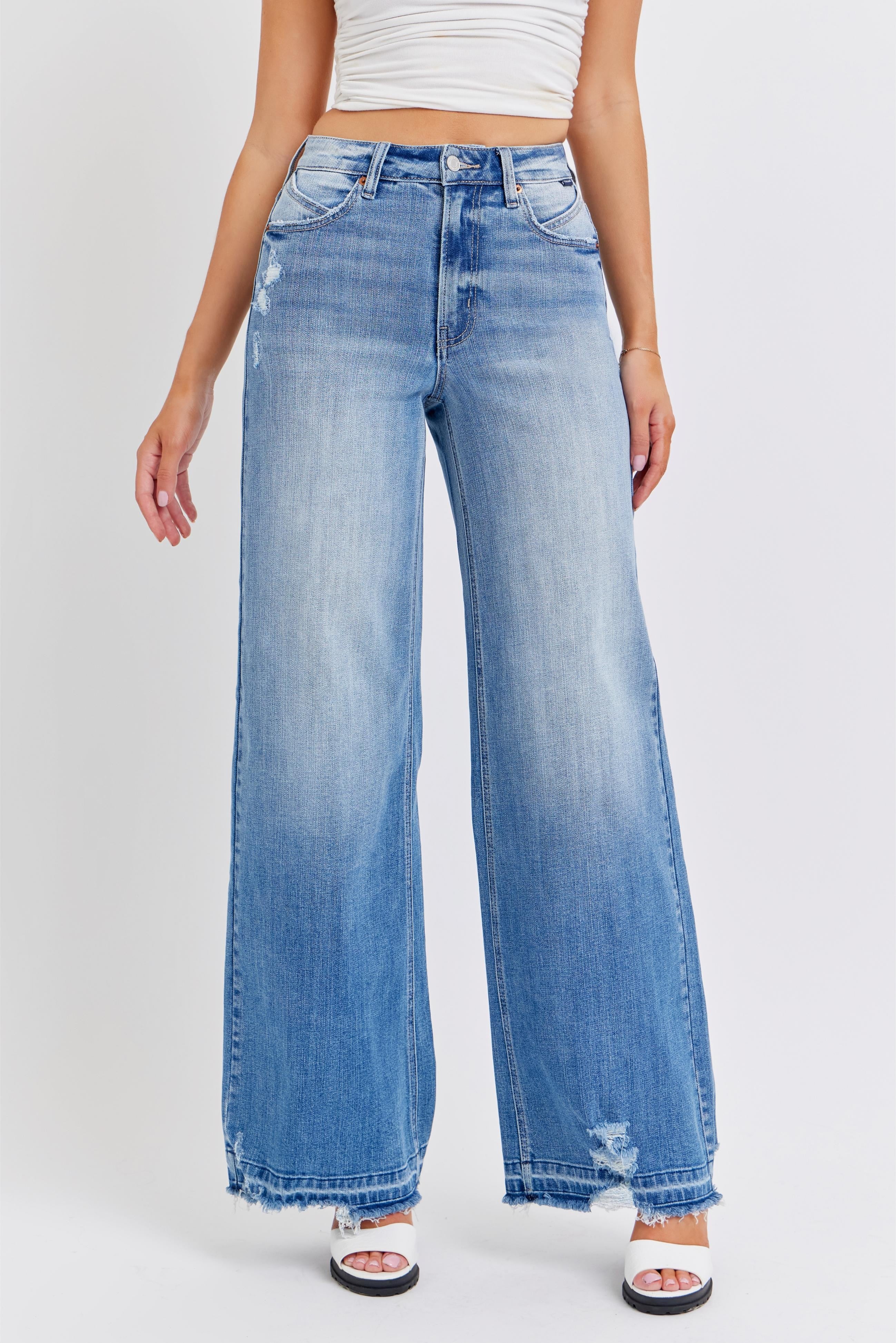 Elevate your style with our Cello High Rise Wide Leg jeans! The high-rise design and wide leg fit create a flattering silhouette while the belt loops and zip fly provide convenience. Made with light denim for a comfortable, stylish look. Imported with a front rise of 11 1/2" and inseam of 32".