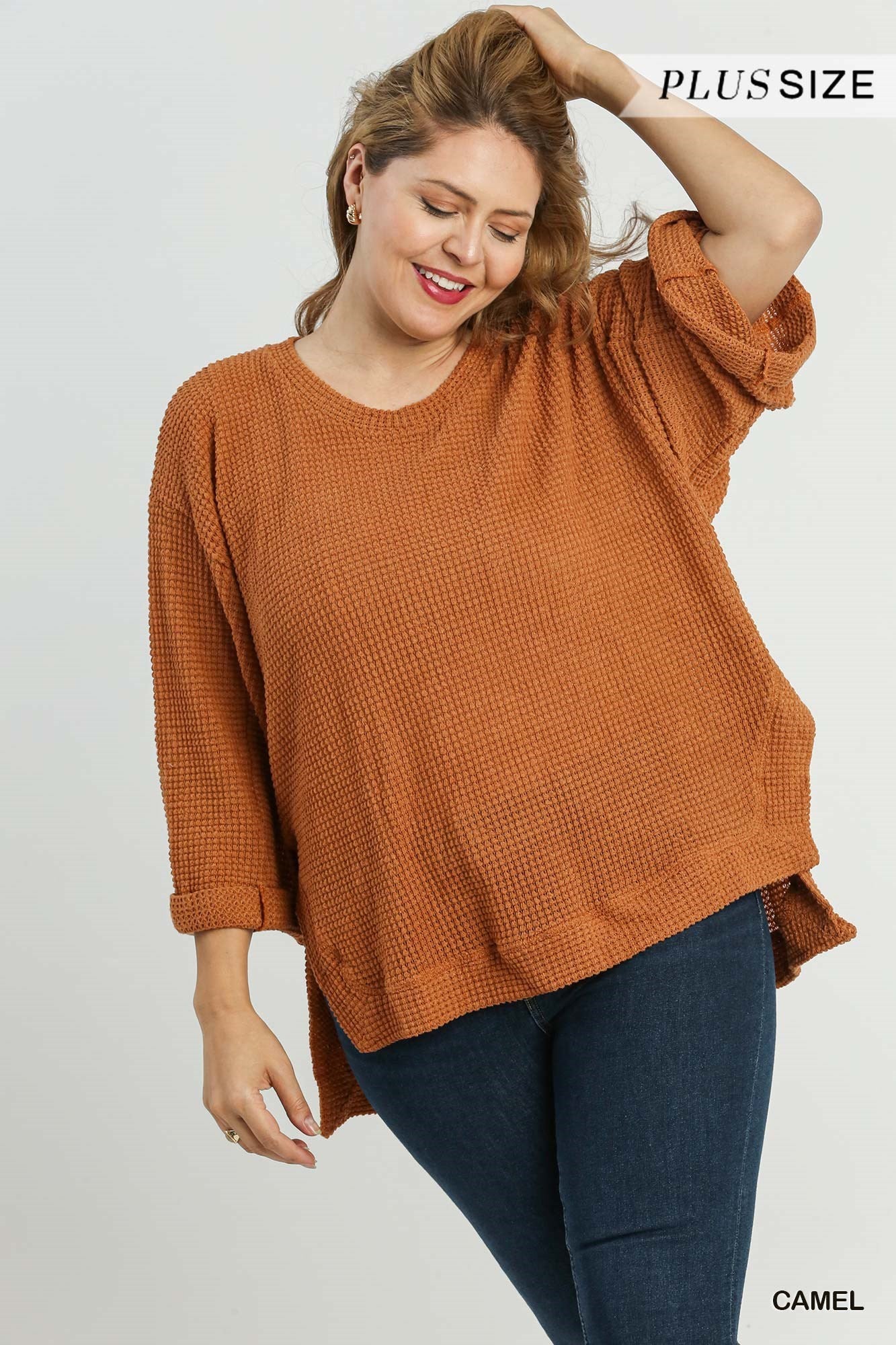 Stay comfortable and stylish in our Cozy Camel Waffle Knit Top, designed with a soft, textured fabric that’s perfect for layering. Featuring a classic round neck, 3/4 rolled sleeves for a relaxed look, and side slits for added ease of movement, this top brings effortless style to your wardrobe. The beautiful camel color is a warm, neutral tone that pairs well with your favorite jeans or leggings. Available in sizes XL to 2XL, this top offers both comfort and a flattering fit for any casual occasion.