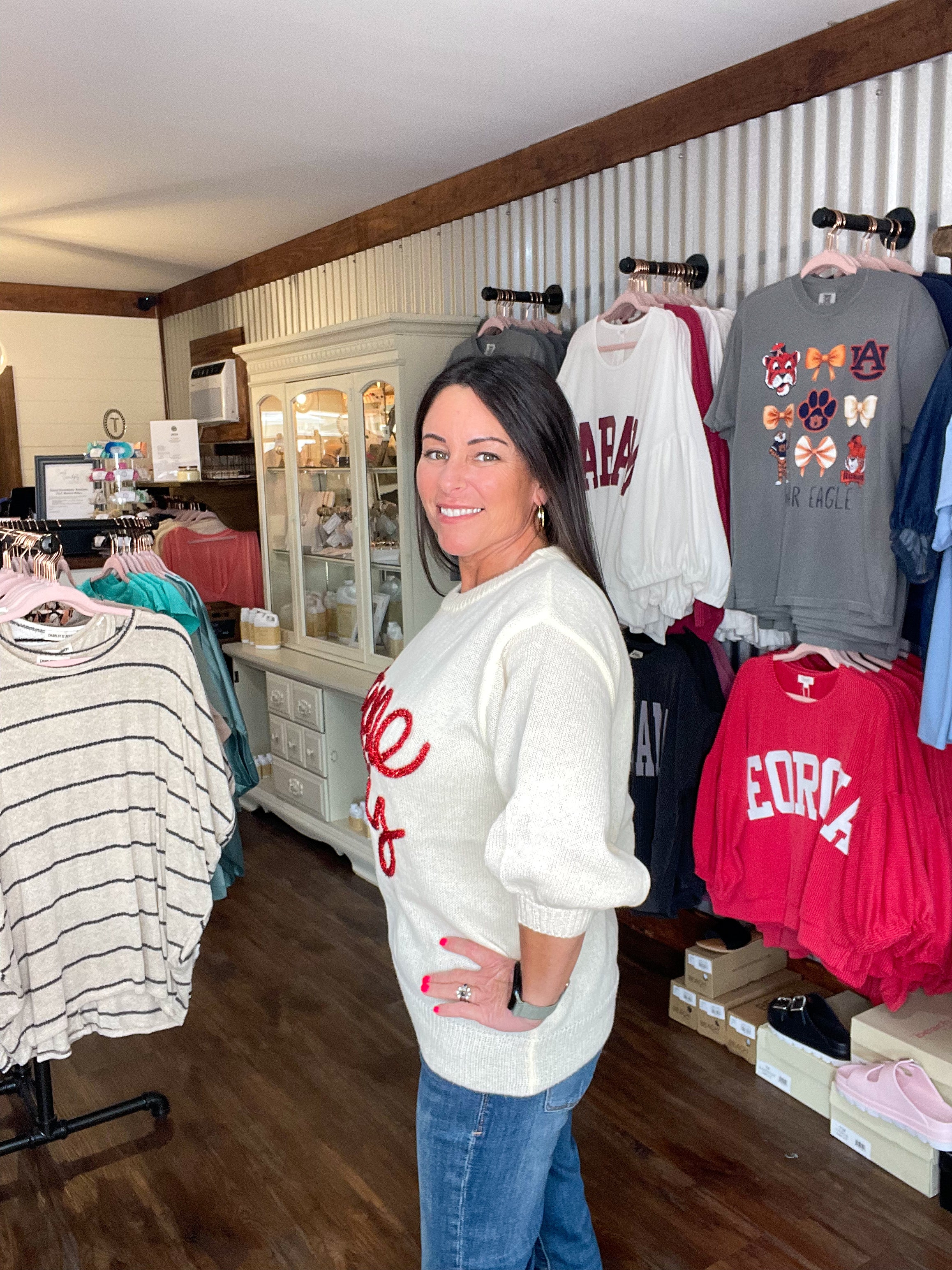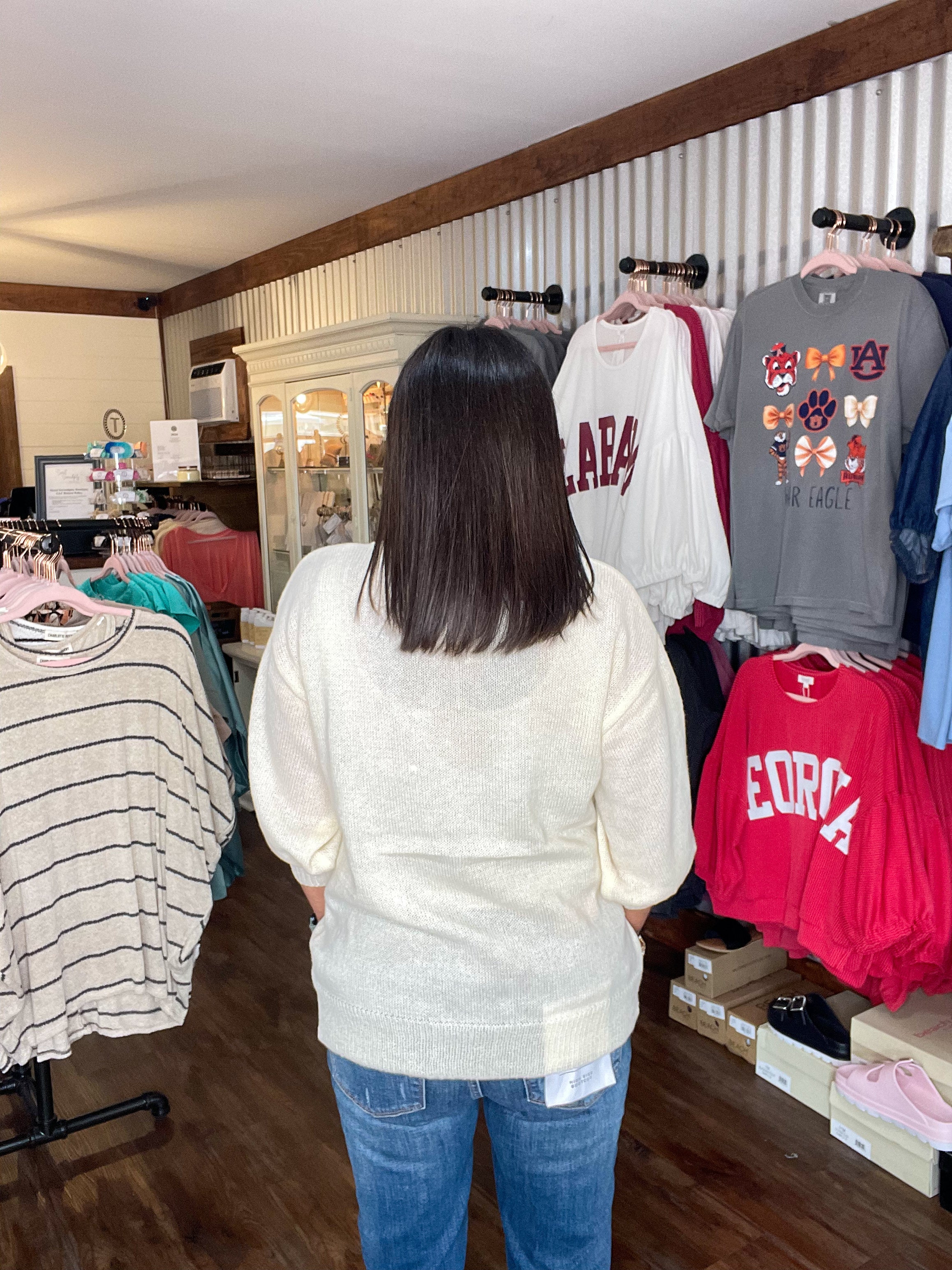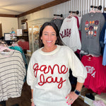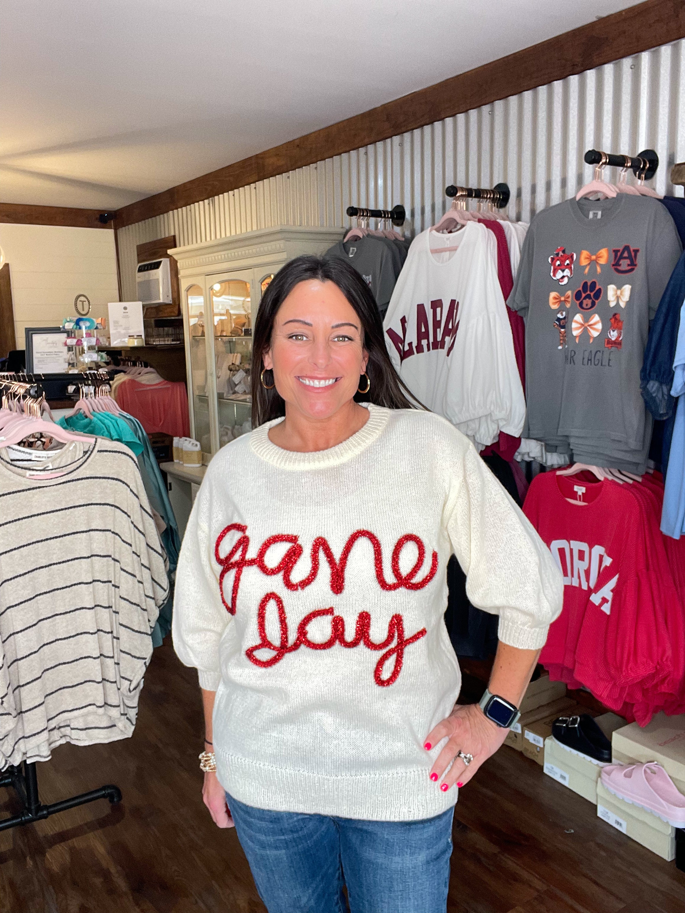 Get ready to win the game in style with our Cream Game Day Sweater! Featuring metallic red lettering and short puff sleeves, this sweater will make you stand out from the crowd. Available in sizes Small-XL, this is the perfect addition to your game day outfit. Show your team spirit and stay cozy at the same time!