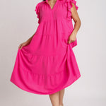 Flaunt your feminine style with our Hot Pink Midi Dress! This elegant tiered ruffle design creates an A-line silhouette, perfect for any body shape. The chic collar adds a touch of sophistication to this must-have dress. Embrace your inner fashionista and stand out in style!