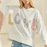 Indulge in an effortlessly stylish and romantic look with our LOVE contrast patch french terry sweatshirt. The intricate embroidery detail adds a touch of elegance to this cozy top, making it the perfect addition to your wardrobe. Show your love with every wear!