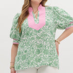 Turn heads in this beautifully detailed floral print puff sleeve blouse — the perfect statement piece for spring and summer. This lightweight woven top features voluminous short puff sleeves, a split V-neckline with a caftan-inspired high neck band, and contrast accents for a touch of elegance. The cuffed sleeves and flattering silhouette make it easy to dress up or down for any occasion.