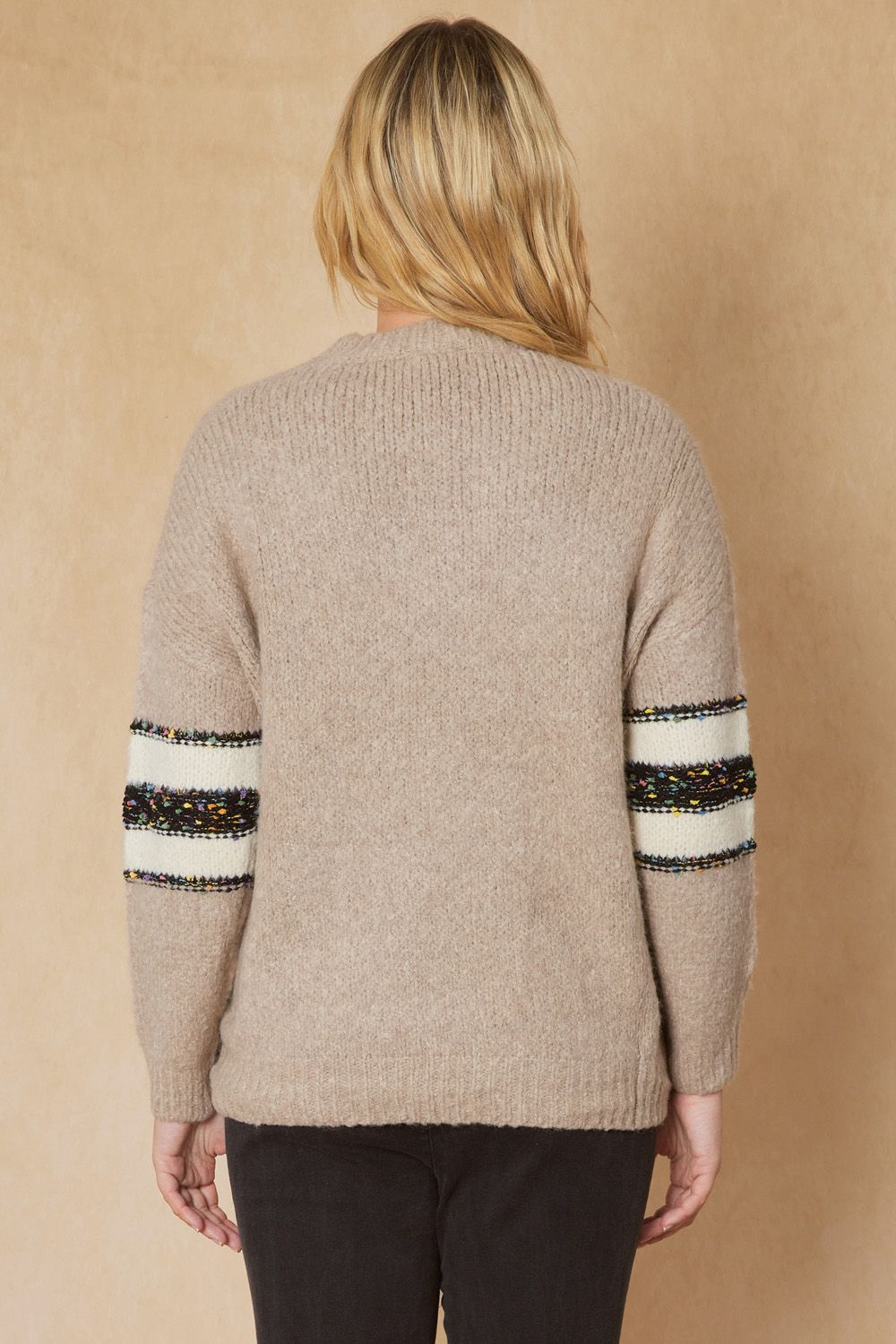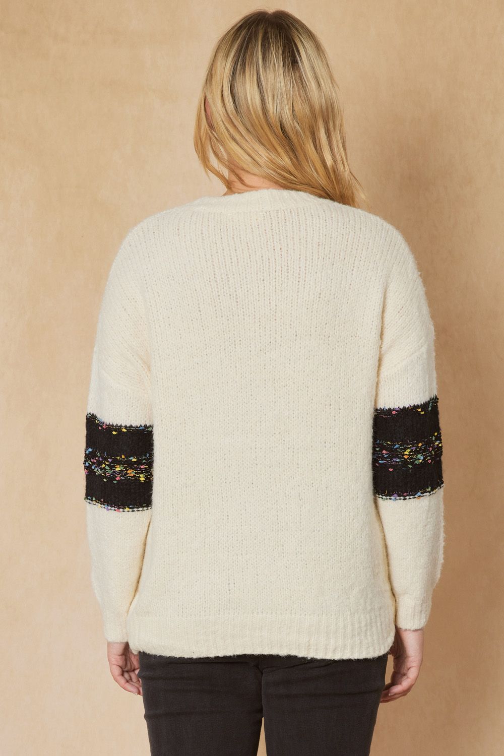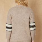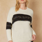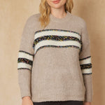 The Curvy StripeLux Sweater adds a pop of color to your wardrobe. It's a cozy pullover with solid round neck, long sleeves, and striking colorblock stripe detail at the bust and sleeves. Unlined, knit, and lightweight, it comes in sizes XL-2XL in Cream Multi and Mocha Multi.